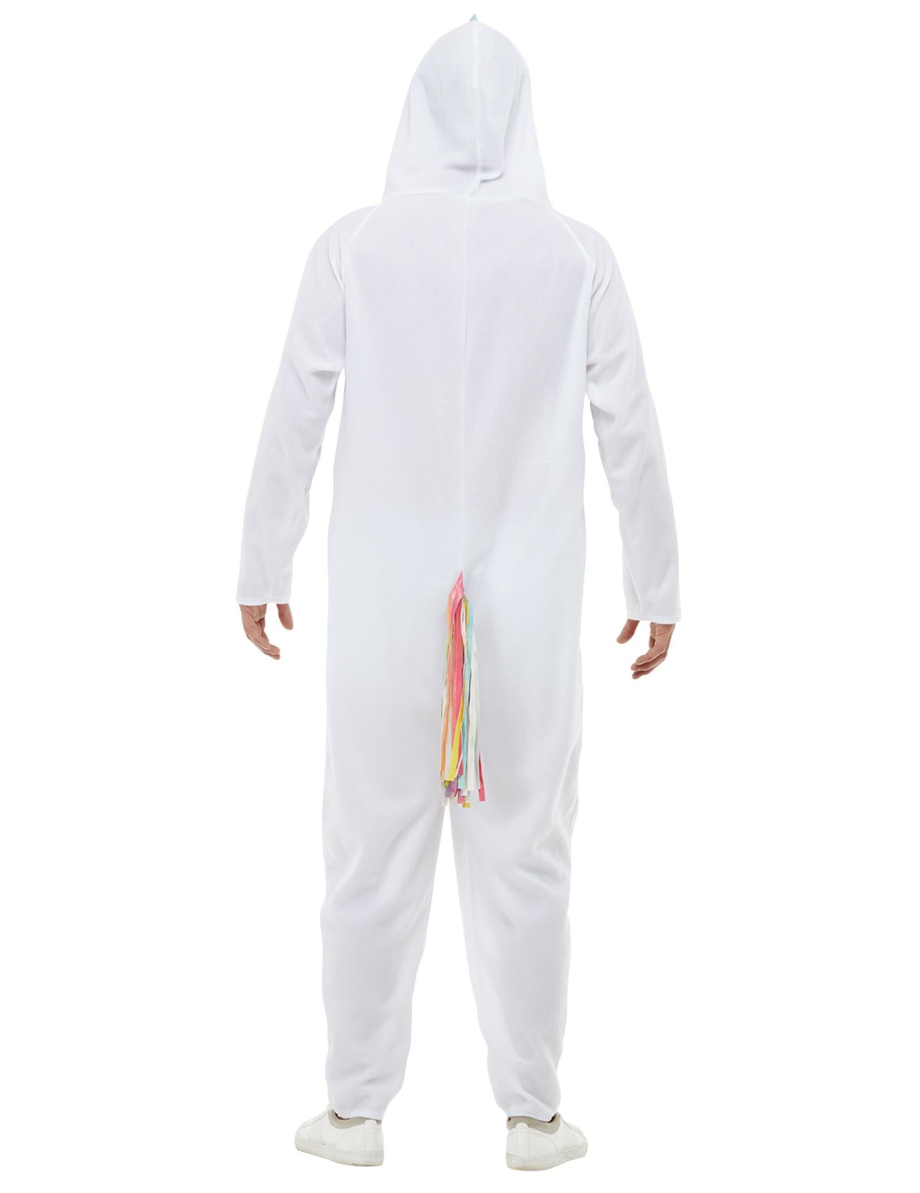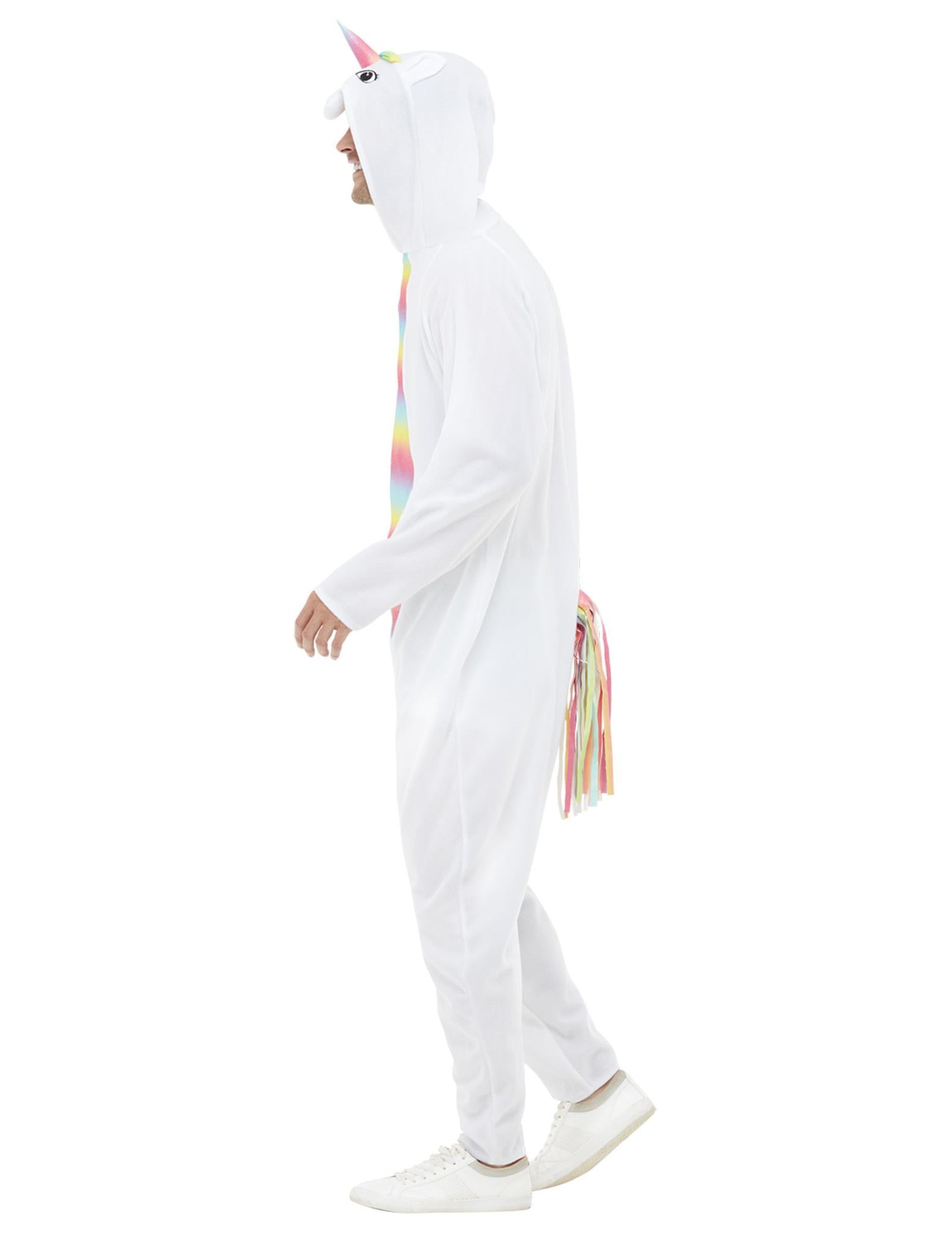 Toto maskovanie dospelých jednorožcov pozostáva z kombinácie. Kombinácia je biela s bruchom vo farbách dúhy. Má kapucňu, ktorá predstavuje hlavu jednorožca. Má uši, nos, oči a viacfarebný roh. Táto kombinácia sa uzatvára vpredu pomocou zipsu. Bude perfektné zakrývať vás ako pekného jednorožca, zatiaľ čo pri príležitosti karnevalu zostanete v teple.