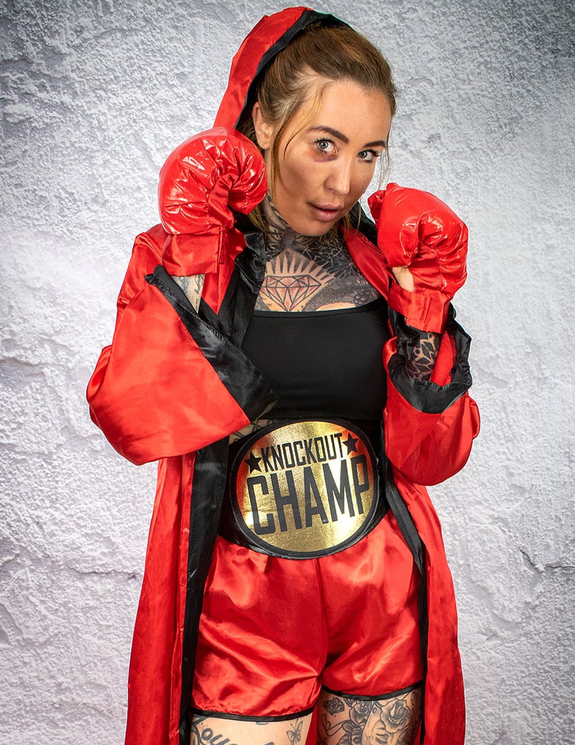 Toto luxusný kostým boxerky pozostáva z topu, šortiek, opasku, rukavíc a županu.