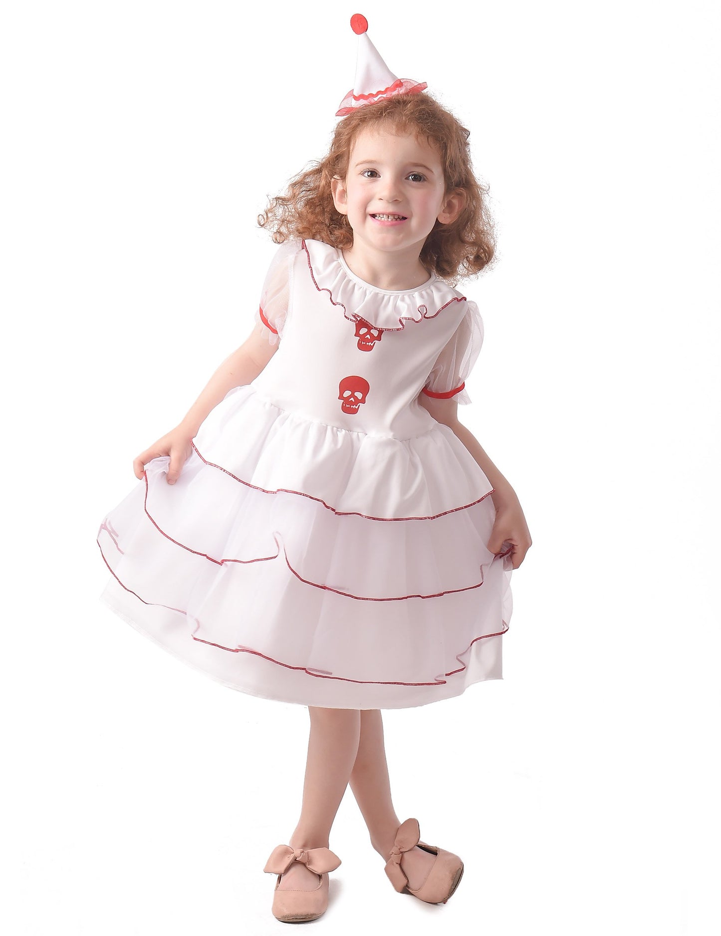 Ce déguisement de clown pour fille se compose d'une robe et d'un serre-tête (chaussure non incluses). Šaty sú biele s červeným okrajom. Na vrchu je zdobený hlavami červenej smrti. Les manches sont en tulle blanc transparent avec un liseré rouge qui rappelle le bas de la robe. Strawberry golier je tiež pozdĺž červeným okrajom. Green siene predstavuje špicatý klobúk v rovnakých farbách ako šaty. S týmto klaunským kostýmom bude vaša dcéra počas Halloweenskej párty zahrať rozkošného desivého klauna!