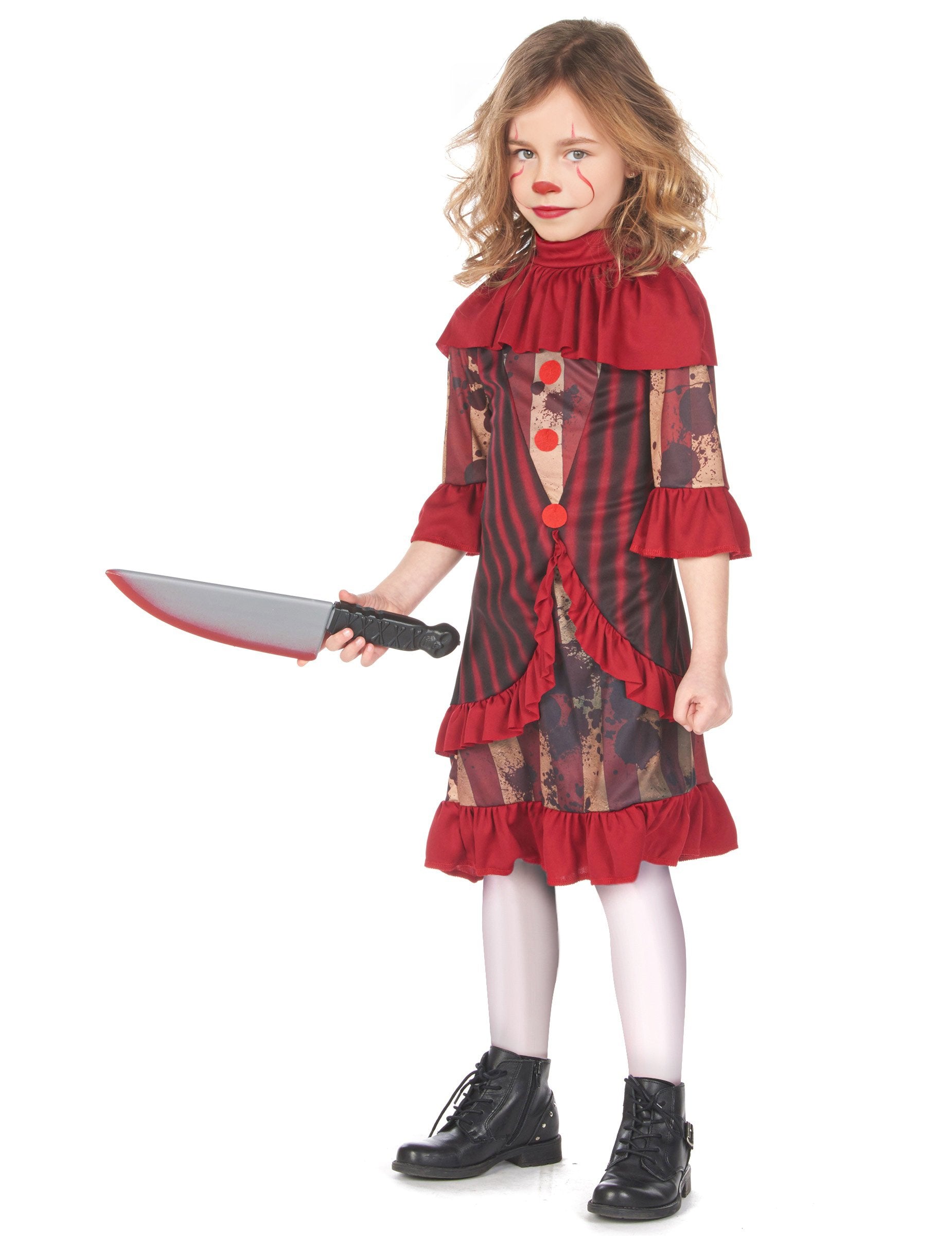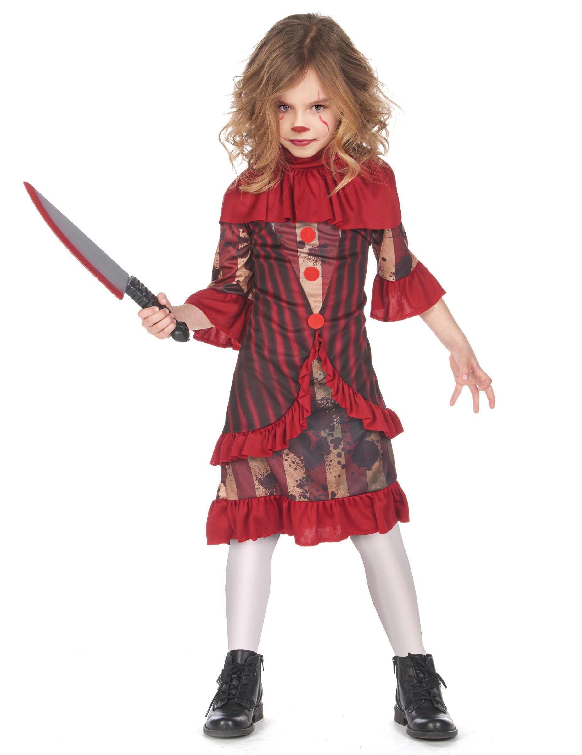 Toto kostým strašidelného klauna pre dievčatá pozostáva zo šiat a goliera (nôž, pančuchy a topánky nie sú súčasťou balenia).