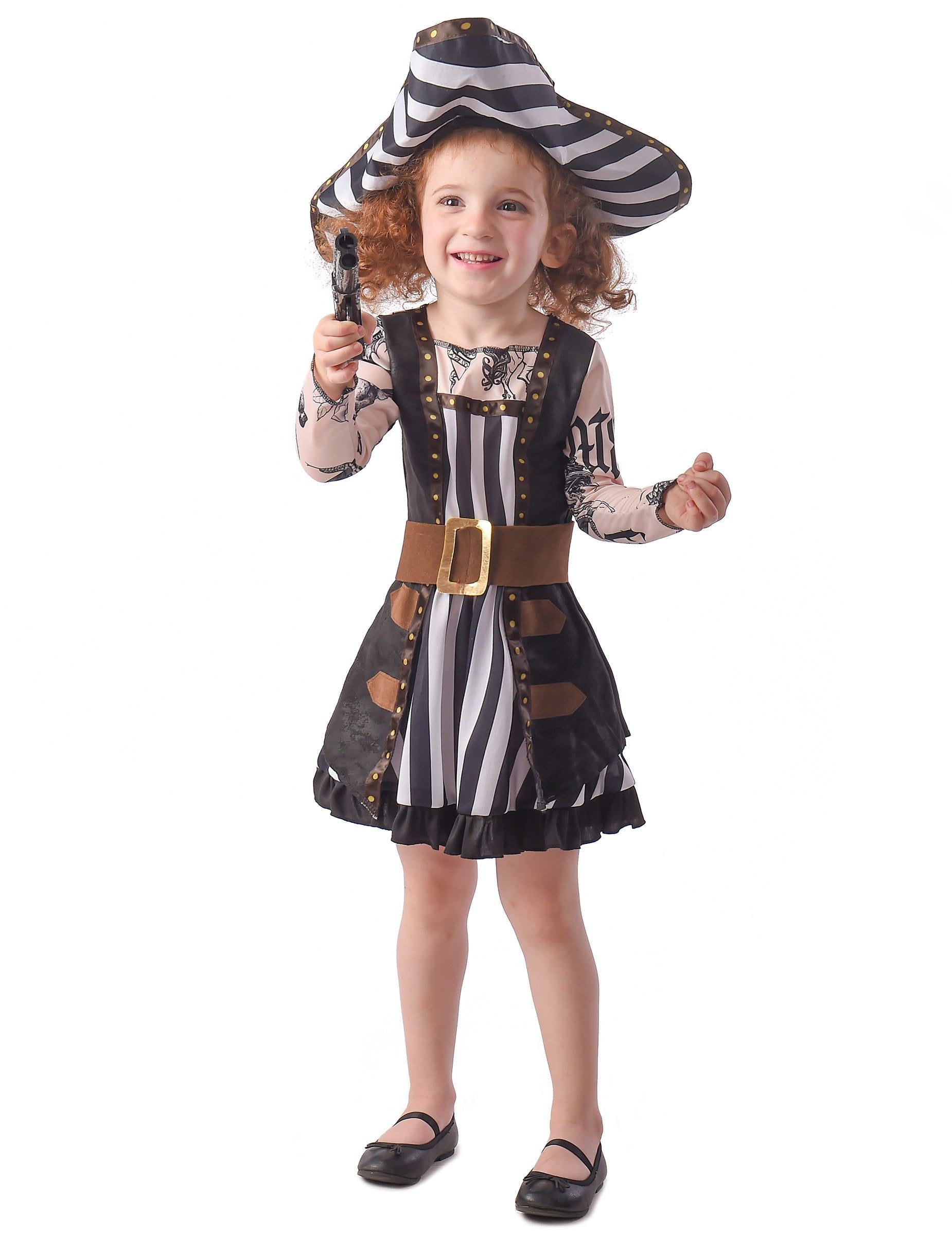 Toto dievča vytetované pirátsky kostým pozostáva z šaty, opasku a klobúka (pištoľ a topánky nie sú vrátane). Šaty sú zdobené čiernymi a bielymi pruhmi. Má falošnú čiernu vestu s hnedými panelmi. Čierne ozdoby zdobia spodok šaty. Rukávy a golier sú biele a sú priehľadné. Sú zdobené čiernymi vzormi, ktoré vyvolávajú dojem, že sú tetované. Hnedý pás so zlatou slučkou. Klobúk je trikón s čiernymi a bielymi pruhmi. Hranica klobúku a hnedej farby so zlatými bodmi. Vaša dcéra bude potešená, že bude hrať skutočného piráta počas karnevalu alebo narodeniny na tému pirátstva!