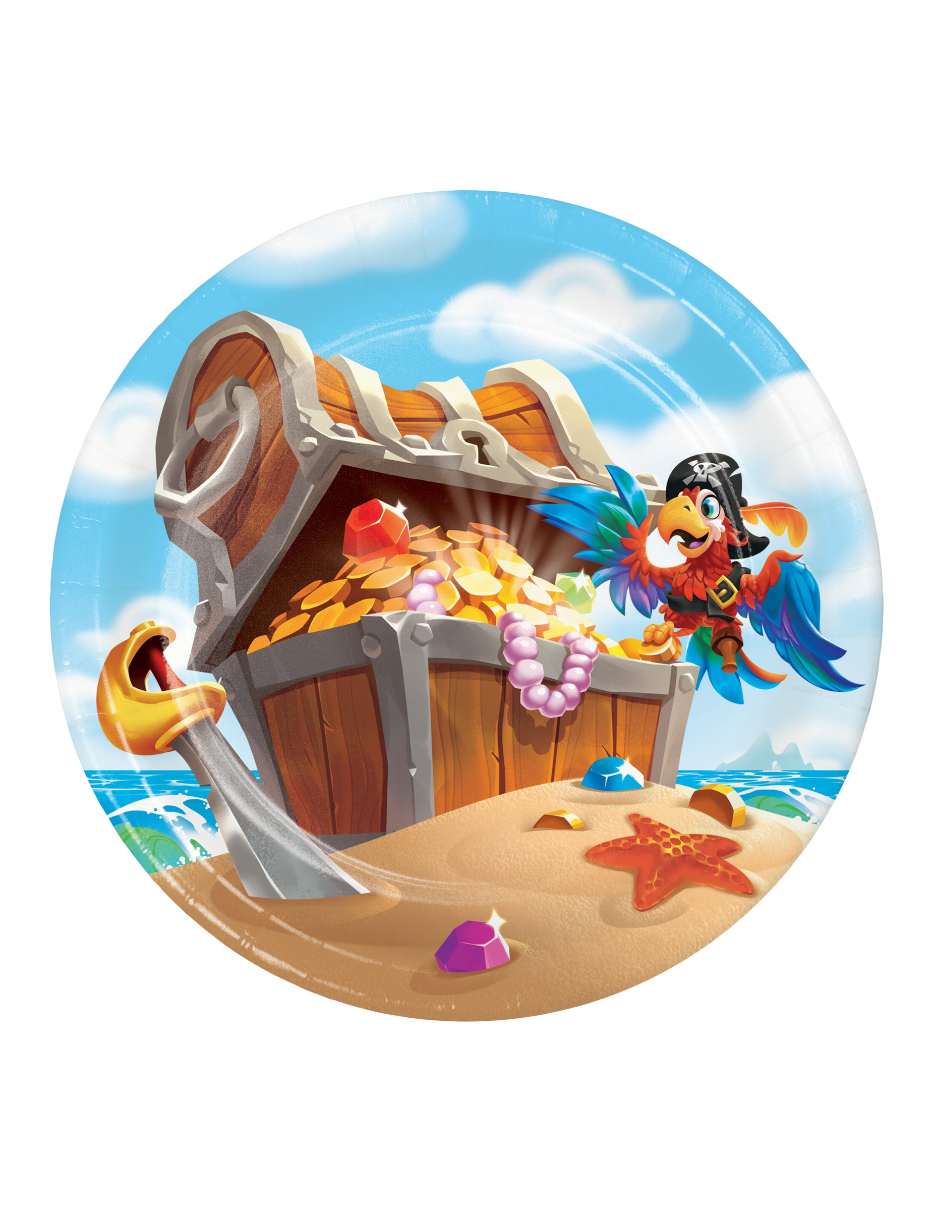 Pripravte si dobrodružný stôl s touto sadou 8 kusov malé taniere Jednorazový kartón. Rozmer 18 cm, majú pirátska truhlica plný bohatstva a šibalského papagája. Ideálne pre narodeninová oslava, tieto taniere dodá vašej dekorácii dokonalý nádych pirátska téma.