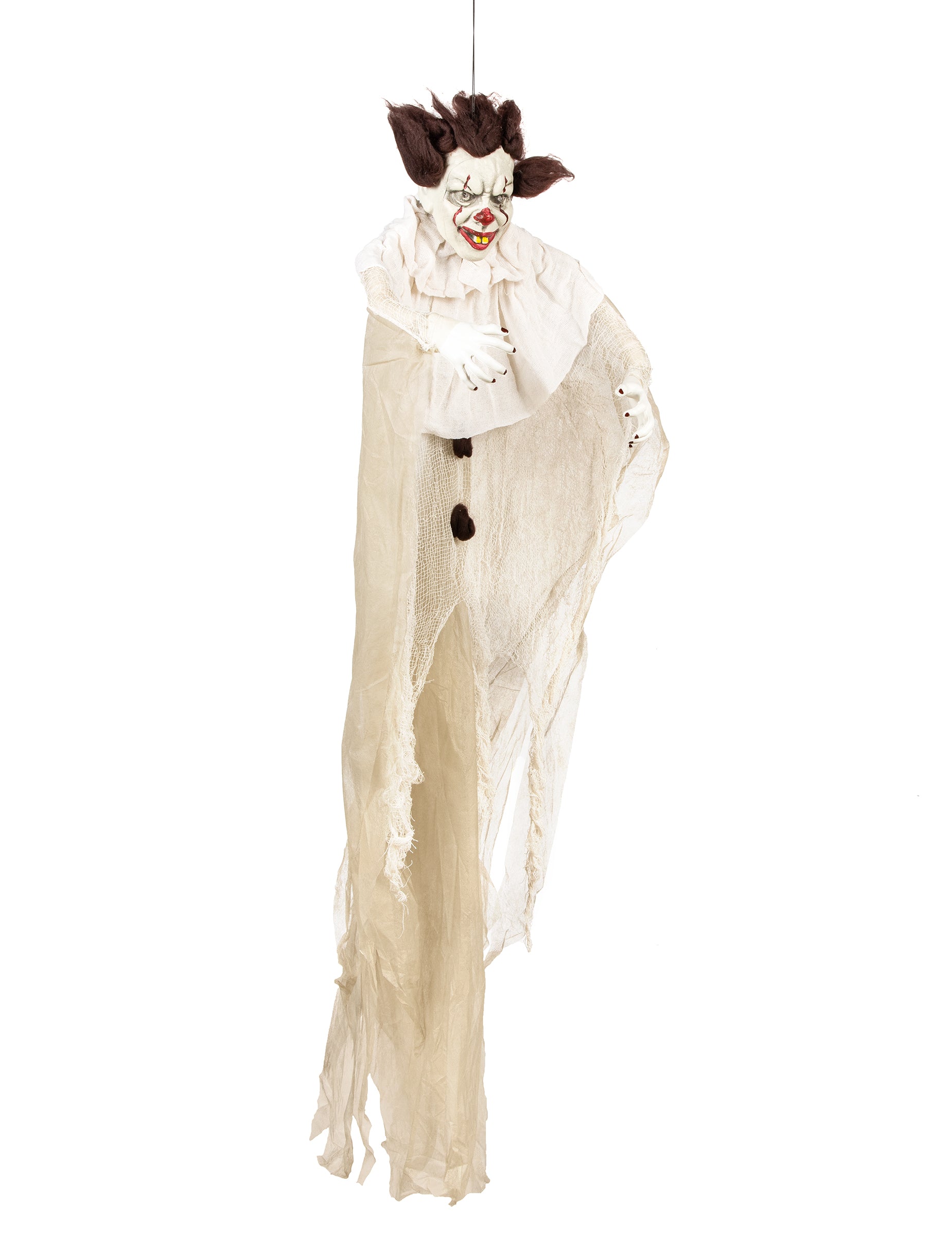 Táto závesná dekorácia predstavuje vraha klauna. Je oblečený v bielych a béžových tkaninách s minulým aspektom. Jeho tvár je biela s vlastnosťami označenými čiernou farbou. Jeho nos je nakreslený v tmavočervenej farbe, rovnako ako jeho ústa. Táto dekorácia meria dĺžku približne 130 cm. Bude to ideálne na vytvorenie desivej cirkusovej dekorácie na Halloween večer.