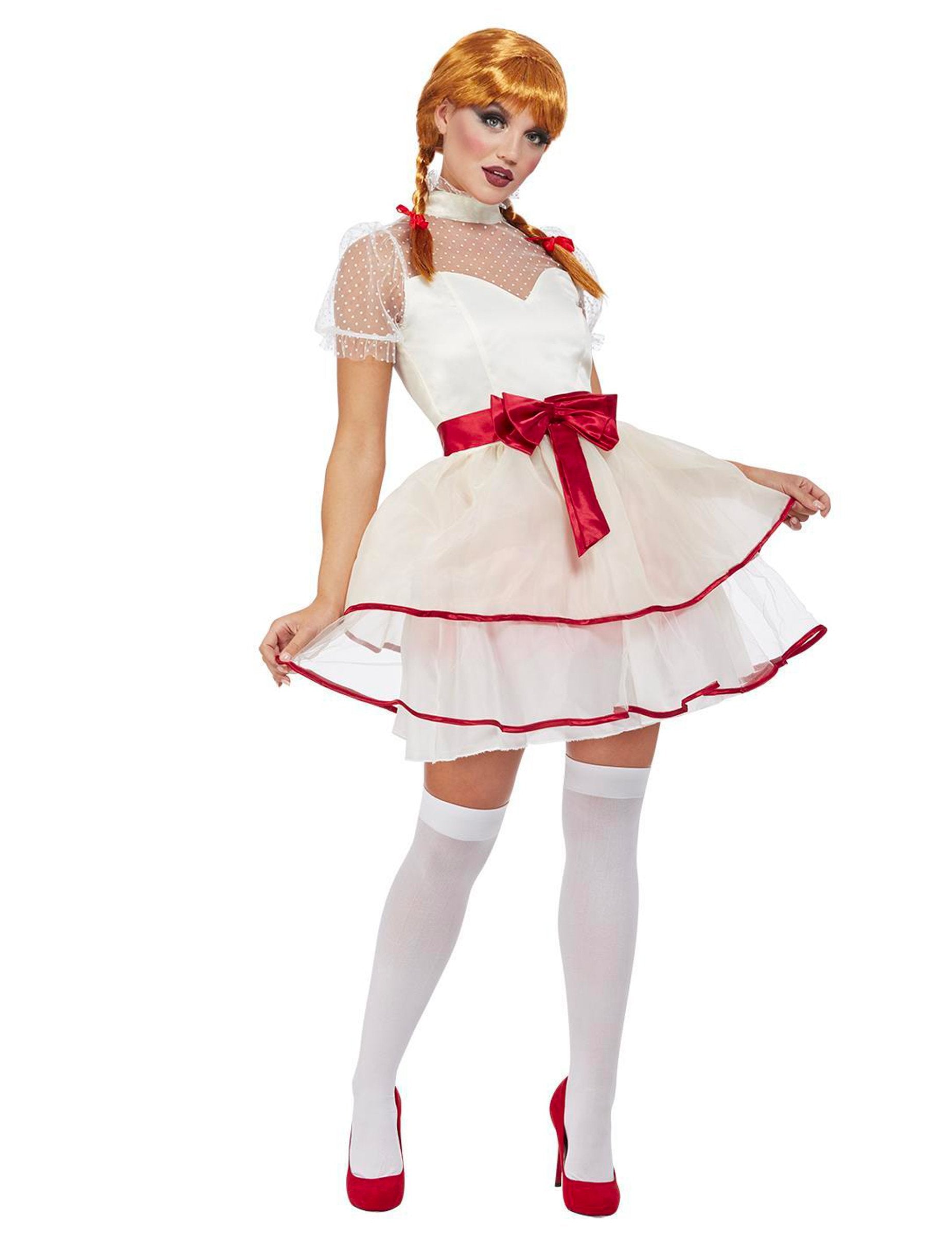 Toto maskovanie porcelánovej bábiky je určené pre ženy a pozostáva z šaty a opasku (topánky, pančuchy a parochňa nie sú zahrnuté). Šaty sú smotanu. Vrchol je tvorený čipkou v rukávoch busta a balónov. Golier je zlomený biely a zvyšok vysokého tvaru je v srdci bustier. Spodná časť šaty je tvorená tylovými vrstvami a bielym spodničkom. Typ má priehľadnú krémovú farbu a je zdobený červeným okrajom. Maskovanie je dokončené červeným pásom so saténom, ktorý sa pripája k prednej časti šaty. Zahrajte si slávnu porcelánovú bábiku a vystrašte svojich priateľov s týmto maskovaním bábik porcelánu pri príležitosti vášho večera Halloween!