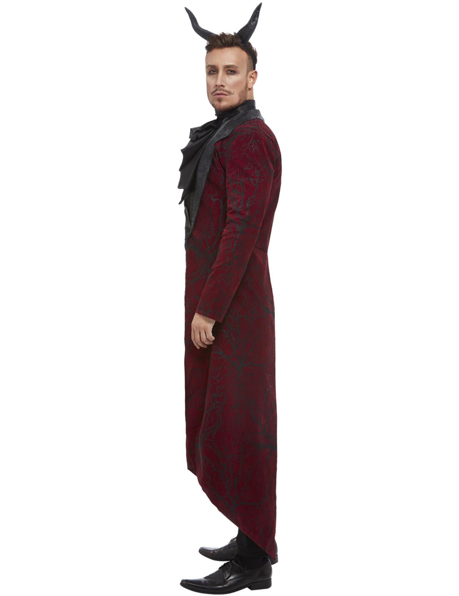 Kravata je čierny jabot so saténovým vzhľadom a veľké čierne rohy dodávajú kostýmu poslednú čertovskú bodku.