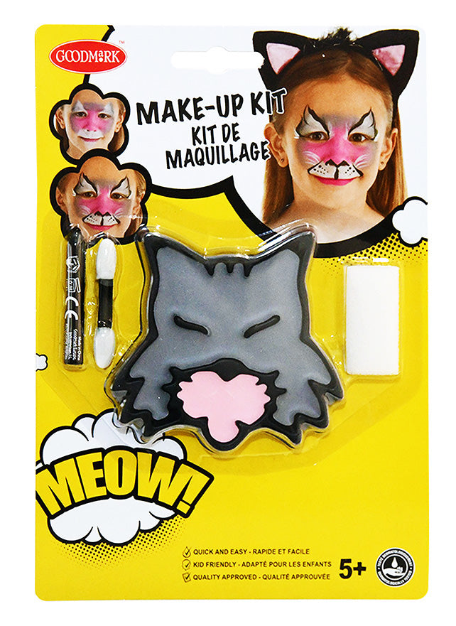 Tento maľovací set malá mačička obsahuje čiernu mastnú ceruzku 1g, paletku na líčenie ružovú a sivú v tvare mačky 6g, aplikátor a hubku.