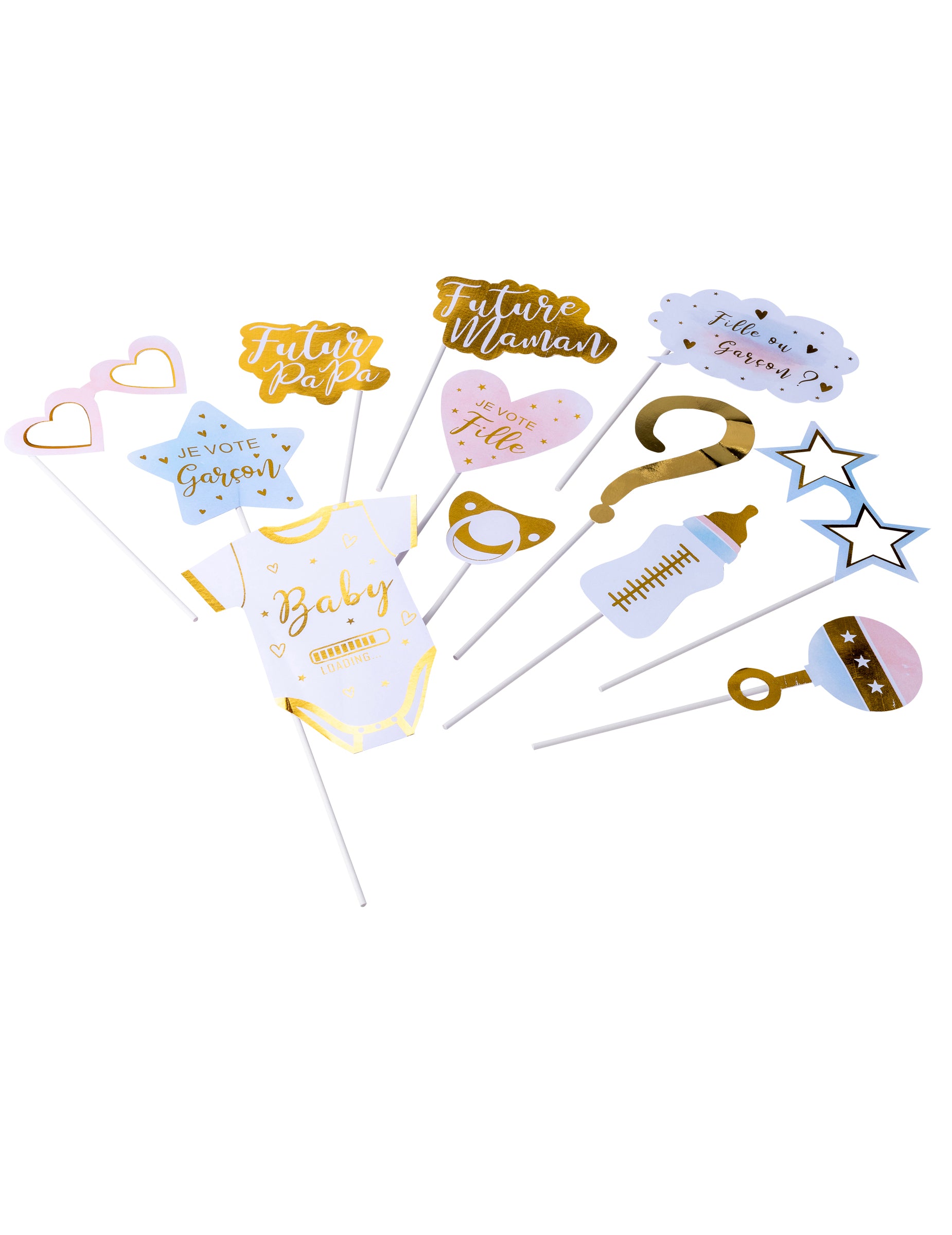 Oživte si párty s odhalením pohlavia s týmto súprava fotobúdky Kompletná sada pozostávajúca z 12 originálnych doplnkov.