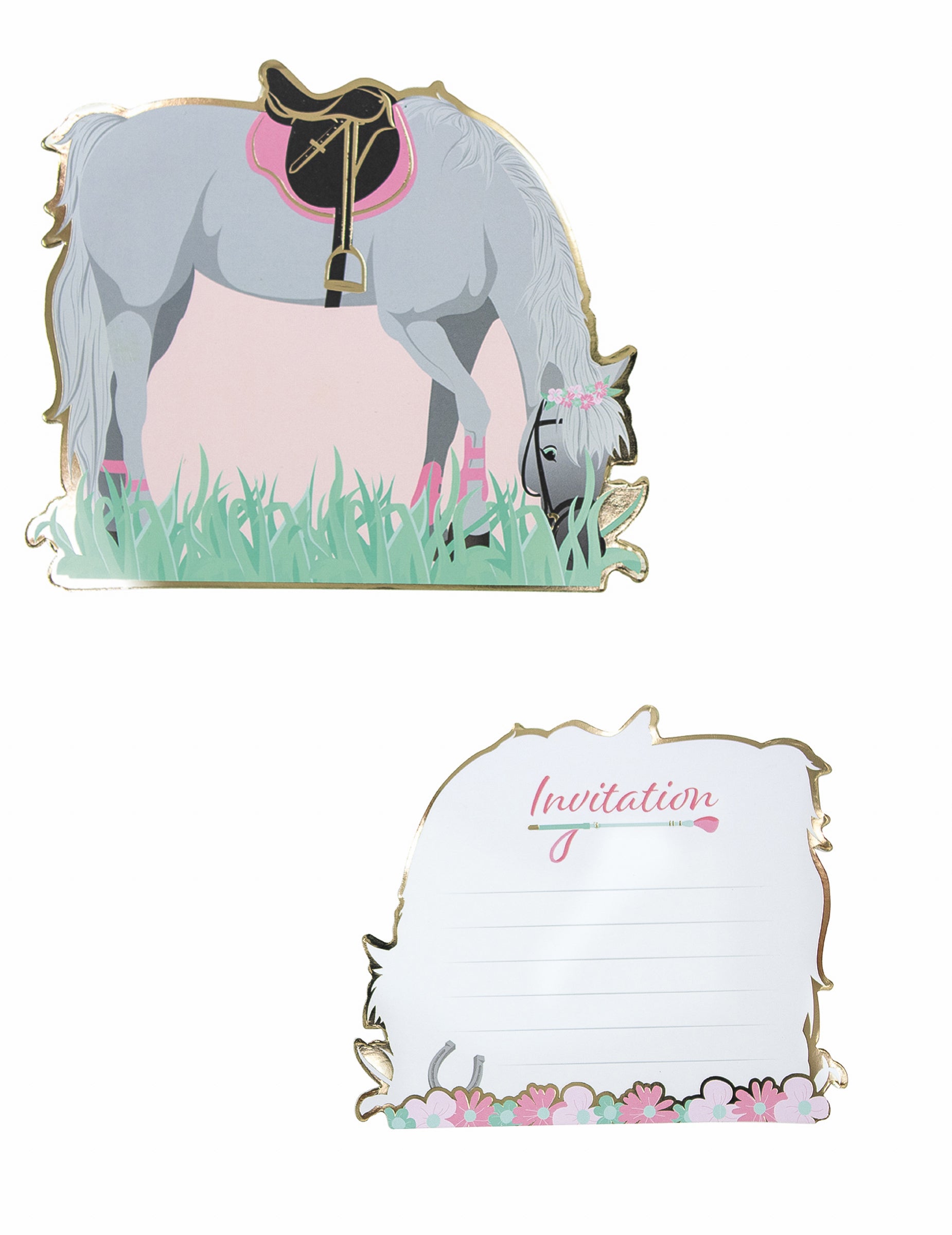 Táto sada pozostáva z 8 pozvánky meria približne 13 cm. Predná strana je znázornená kôň Sivá sa pasie na lúke, zatiaľ čo rubová strana je vyhradená na zapísanie podrobností o oslave. pozvánky dovolí vašej dcére pozvať svojich priateľov na narodeniny na tému jazdy na koni.