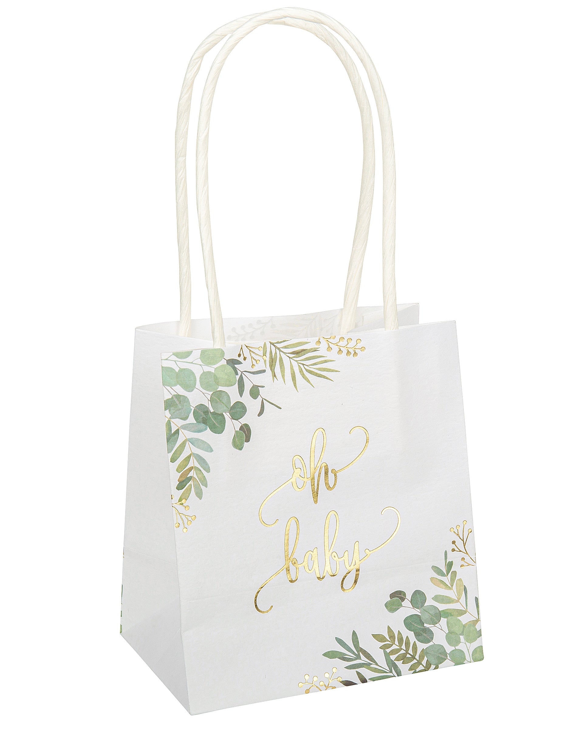 6 eukalyptových darčekových vrecúšok Oh Baby so zlatým fóliovým lemom, 10 x 18 x 5 cm cm s rukoväťami