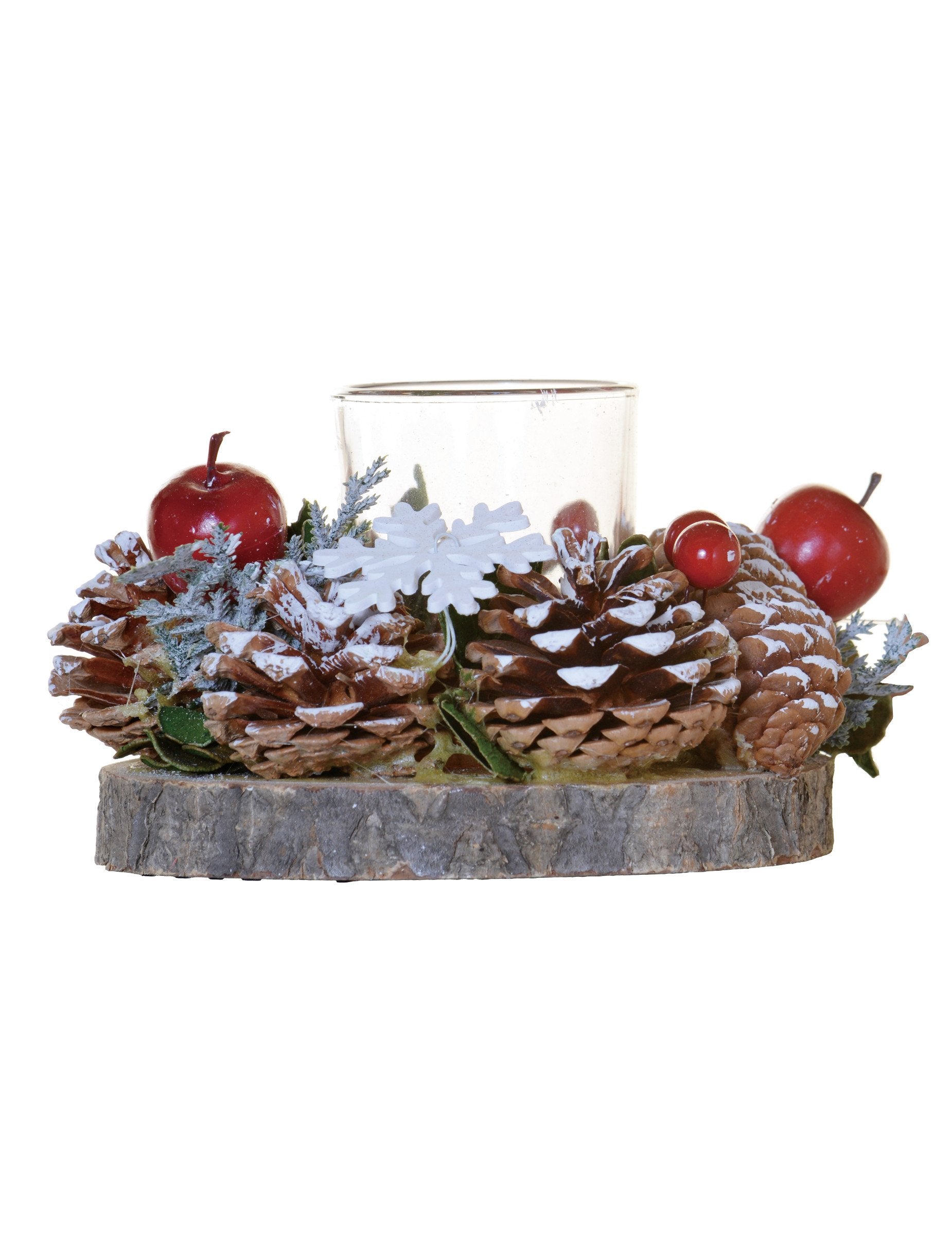 S priemerom 15 cm, toto očarujúce držiak na sviečky Stojí na podstavci z prírodného dreva. Je ozdobený šiškami, červenými bobuľami a snehovými vločkami pre autentickú zimnú atmosféru. Stačí umiestniť sviečku do stredu a vytvoriť tak hrejivú atmosféru. Tento doplnok bude perfektný na zdobenie vášho... tradičný vianočný stôl s eleganciou.