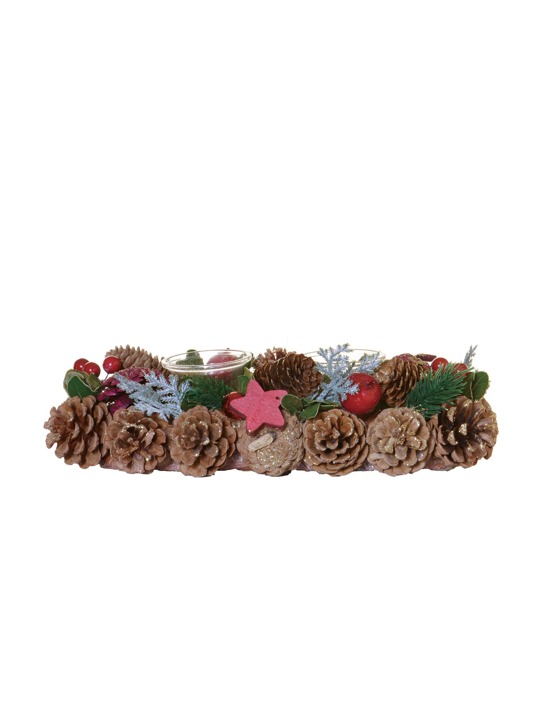 S dĺžkou 30 cm, Toto stredový ornament dodá vašim sviatočným dekoráciám rustikálny nádych. Skladá sa z dvoch sklenených držiakov obklopených skutočnými šiškami, jedľovými vetvičkami, malými bobuľami a ozdobnými hviezdičkami. Stačí pridať dve čajové sviečky a vytvoriť tak útulnú atmosféru. Je to perfektný doplnok na vytvorenie... farebný a žiarivý vianočný stôl počas vašich rodinných jedál.