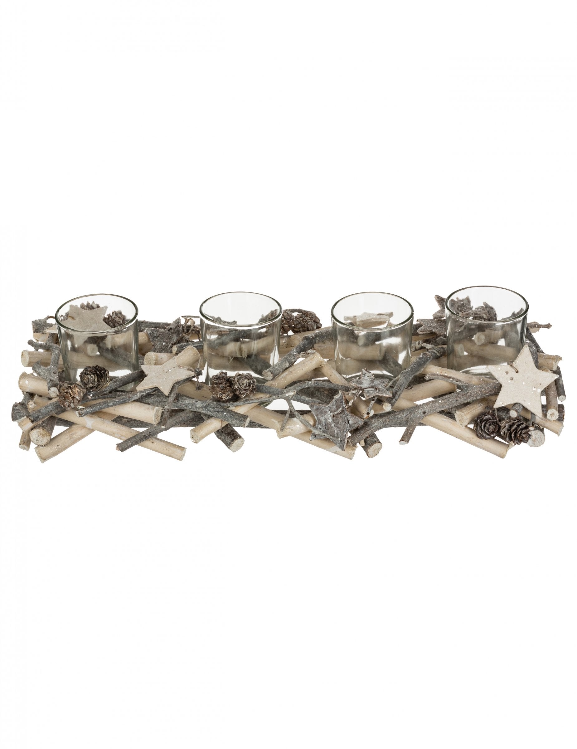 S dĺžkou 38 cm, Toto stredový ornament dodá vášmu interiéru rustikálny nádych. Skladá sa zo 4 svietniky sklenené nádoby obklopené sivými drevenými polenami, šiškami a peknými ozdobnými hviezdičkami. drevené svietniky sú ideálne na vytvorenie priateľskej a autentickej atmosféry počas vašej silvestrovskej oslavy. Vianoce.