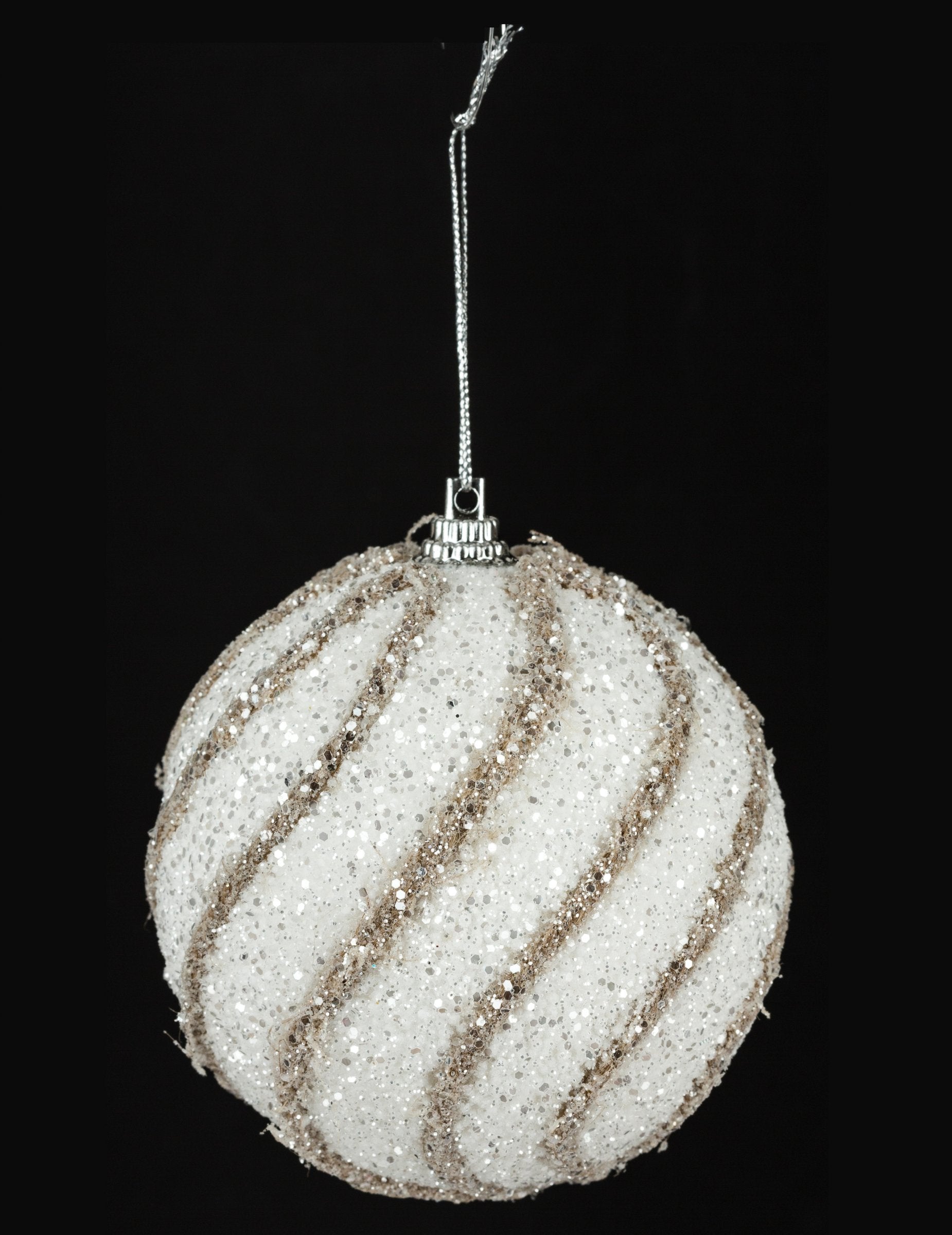 Táto vianočná lopta má priemer asi 8 cm. Je zdobený flitrami a bielymi a zlatými špirálami. S touto loptou vyplňte svoju vianočnú dekoráciu na magickú tému!
