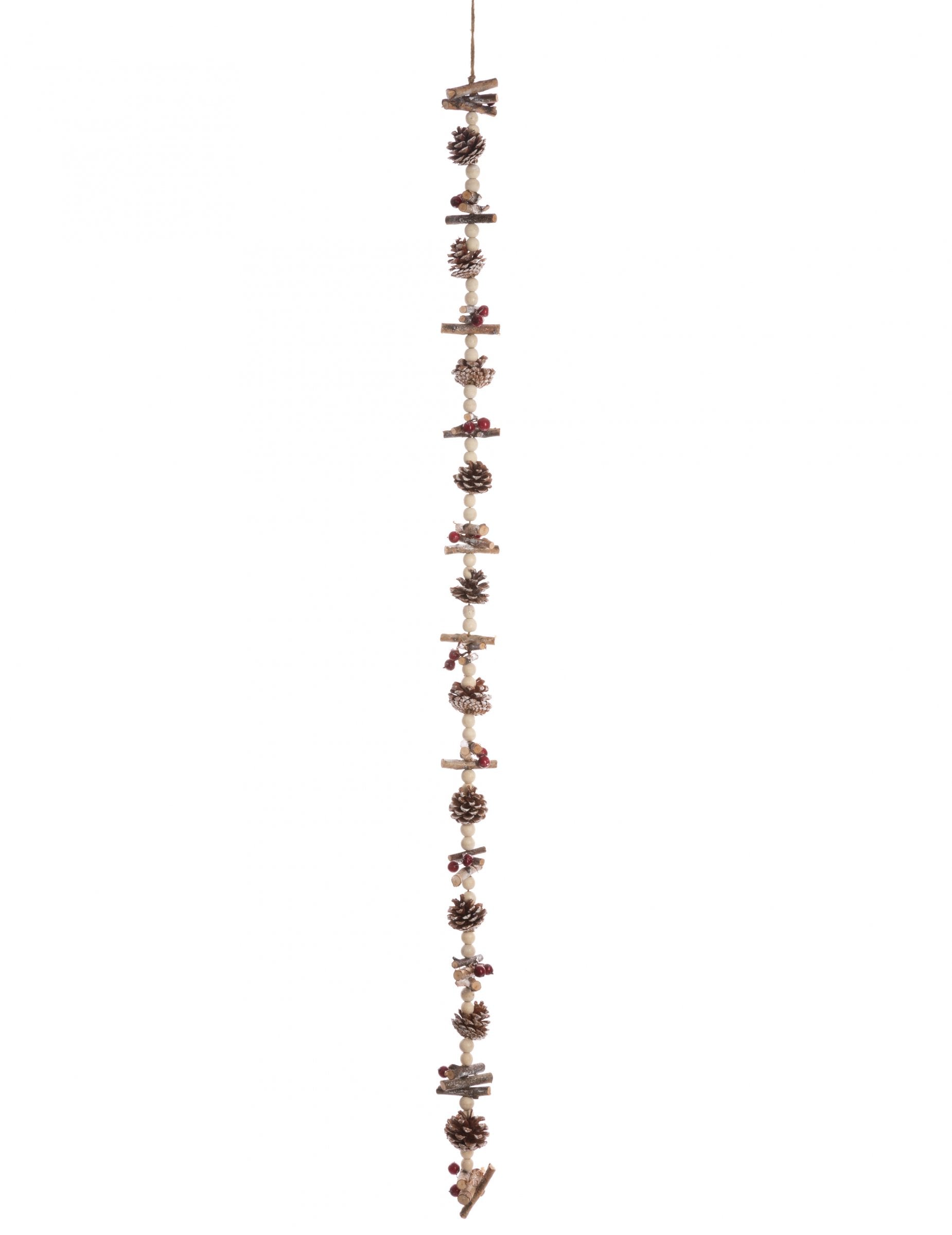 Tento girland meria dlhé približne 150 cm. Je tvorený perlami sprevádzanými borovicovými kužeľmi a malými kúskami dreva. Dokončite svoju dekoráciu na tému prírody týmto girlandom na Vianoce v lese!
