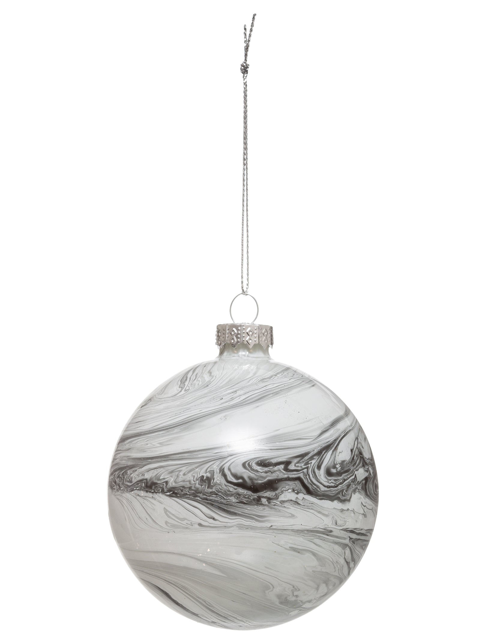 Vylepšite si dekoráciu týmto Vianočná guľa meranie 8 cm priemeru. Tento sklenený model sa vyznačuje nádherným mramorovaným vzorom v odtieňoch bielej a sivej. mramorovaná guľa dodá vášmu štýlu nádych elegancii a modernosti Vianočný stromček počas sviatkov.