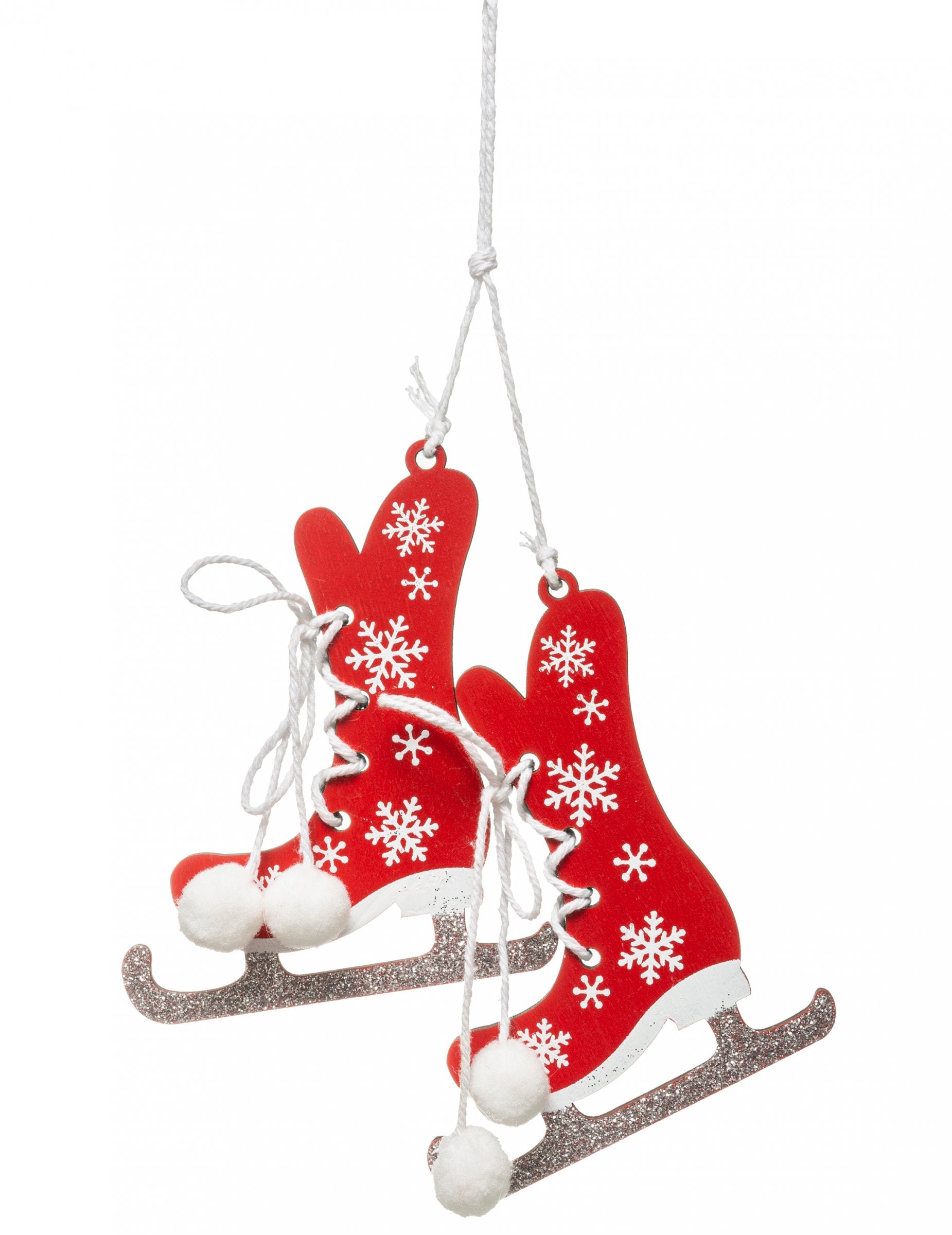 Táto drevená zavesenie FIR meria asi 10 cm dlhé. Predstavuje dve červené a biele podložky zmrzliny, zdobené malými pompommi. Ozdobte svoj strom týmito malými korčuľami na tradičné Vianoce!