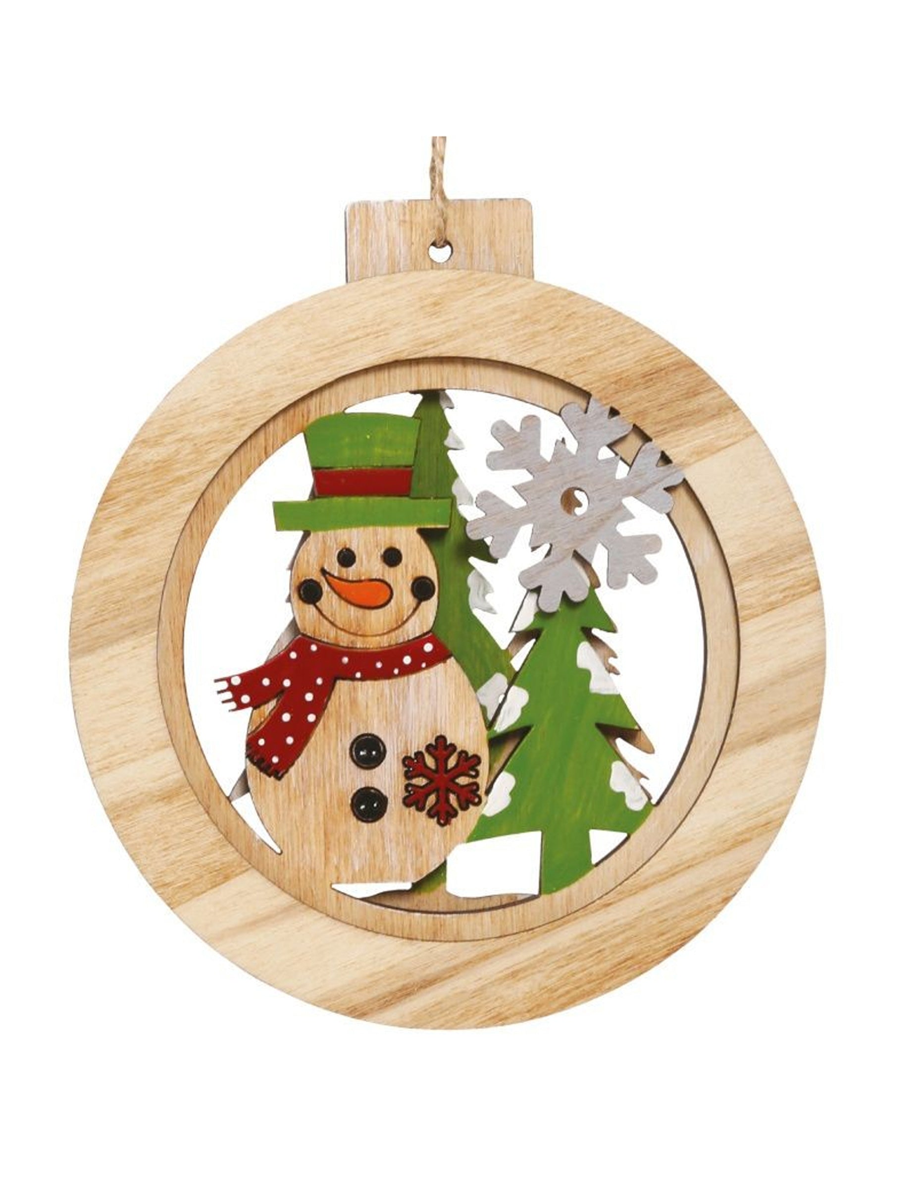 Táto krásna ozdoba sa vyznačuje snehuliak obklopený jedľami a snehovou vločkou, v klasických farbách červenej a zelenej.