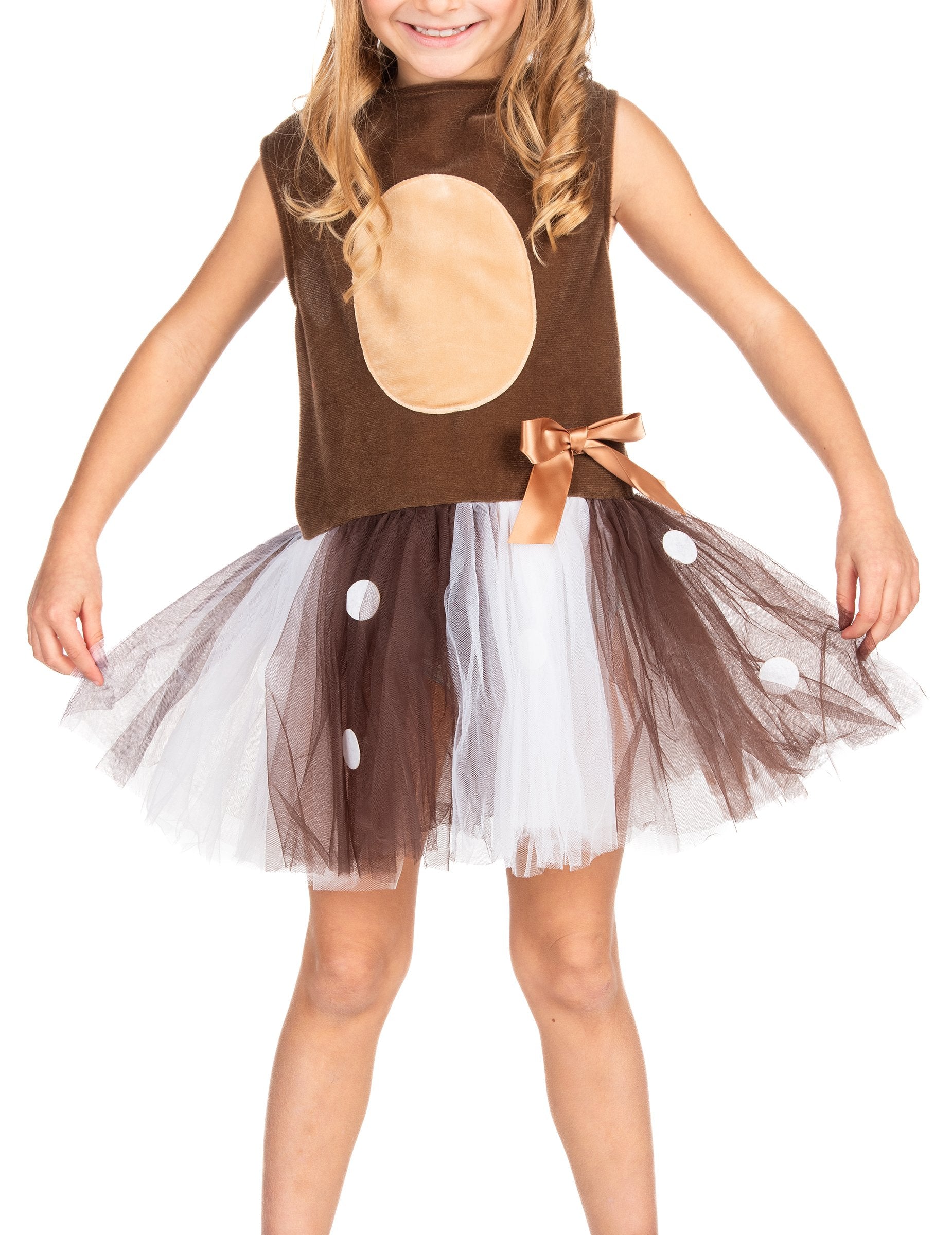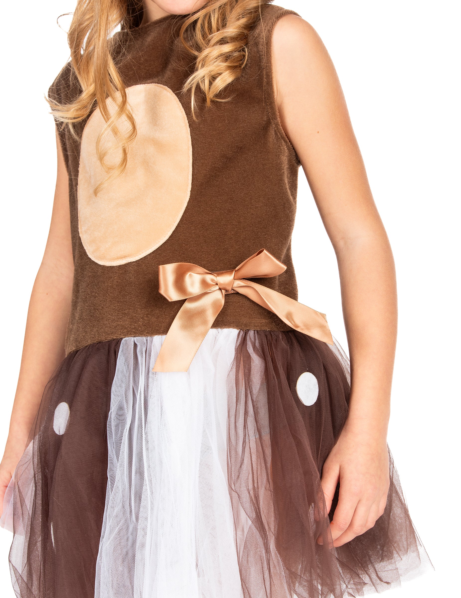 Vrchná časť dievčenských šiat je hnedá a má viacfarebnú nafúknutú tylovú sukňu (ružová, hnedá, biela).