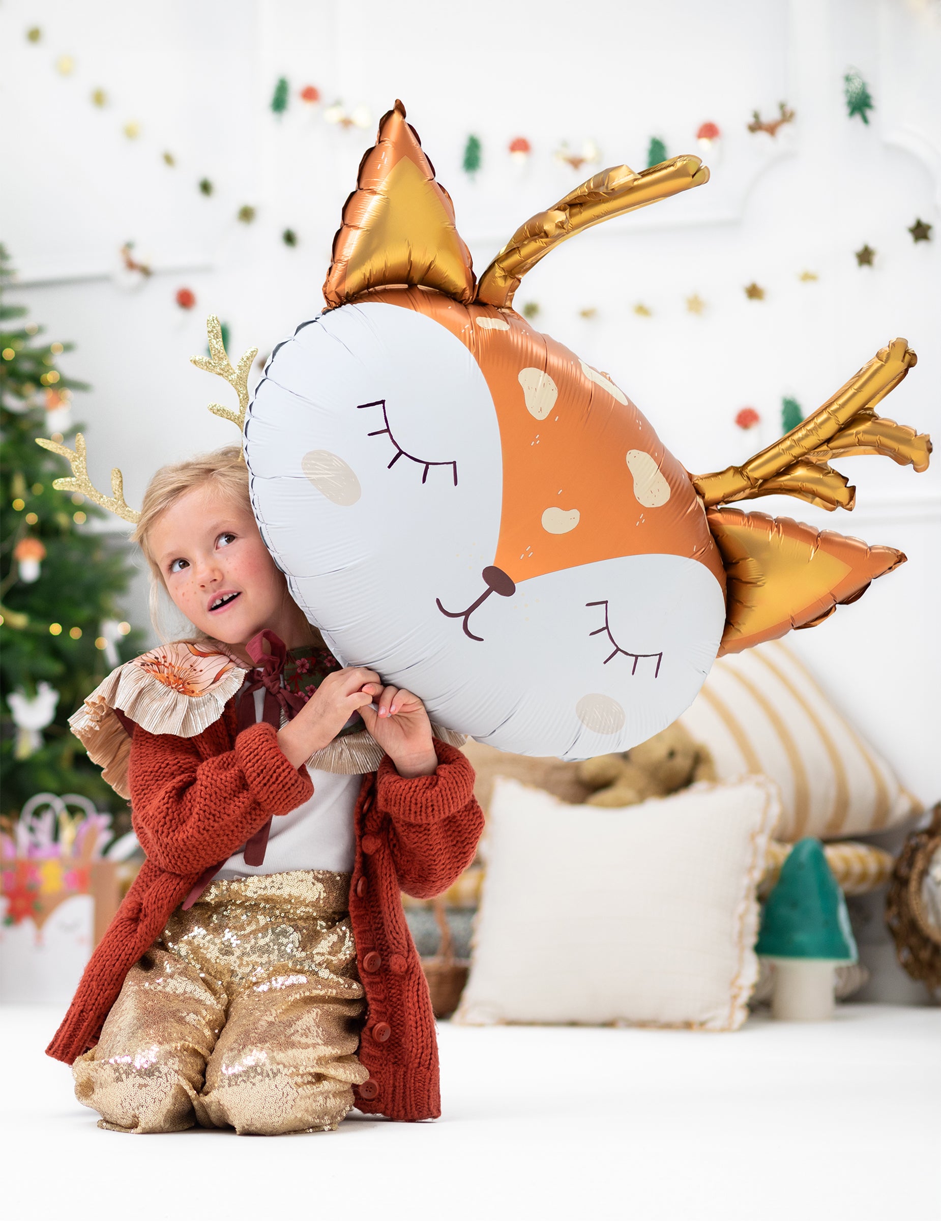 Tento obrovský balón meria približne 73 x 64 cm. Predstavuje červenú a bielu hlavu jeleňov. V hliníku ho môžete nafúknuť vzduchom alebo héliom, aby ste mohli lietať. Táto jeleňová guľa bude ideálna na dokončenie vianočnej dekorácie lesnou atmosférou!
