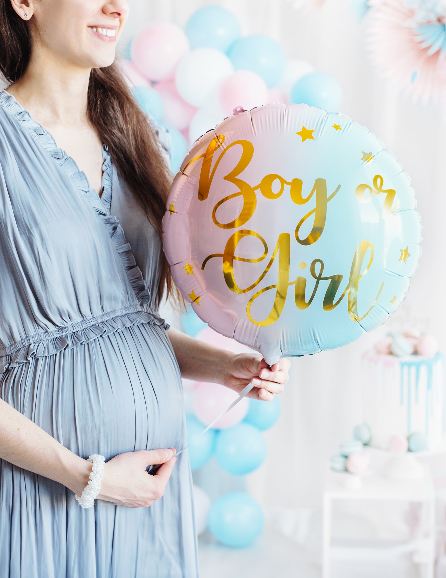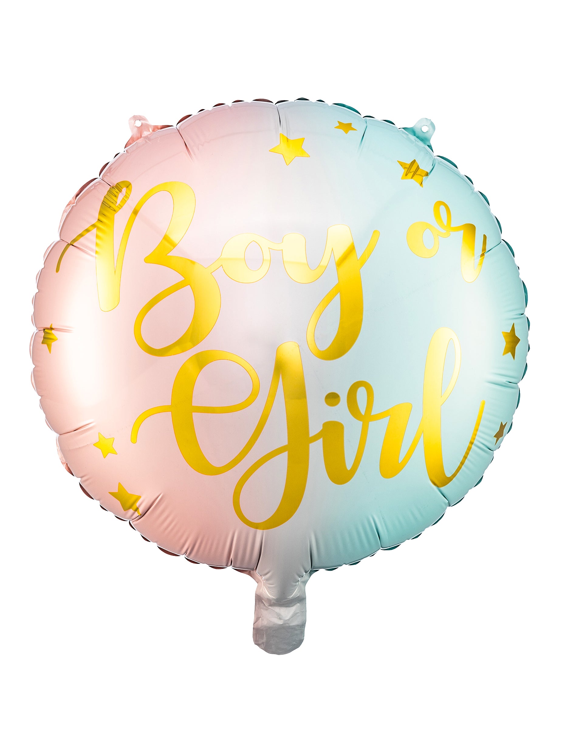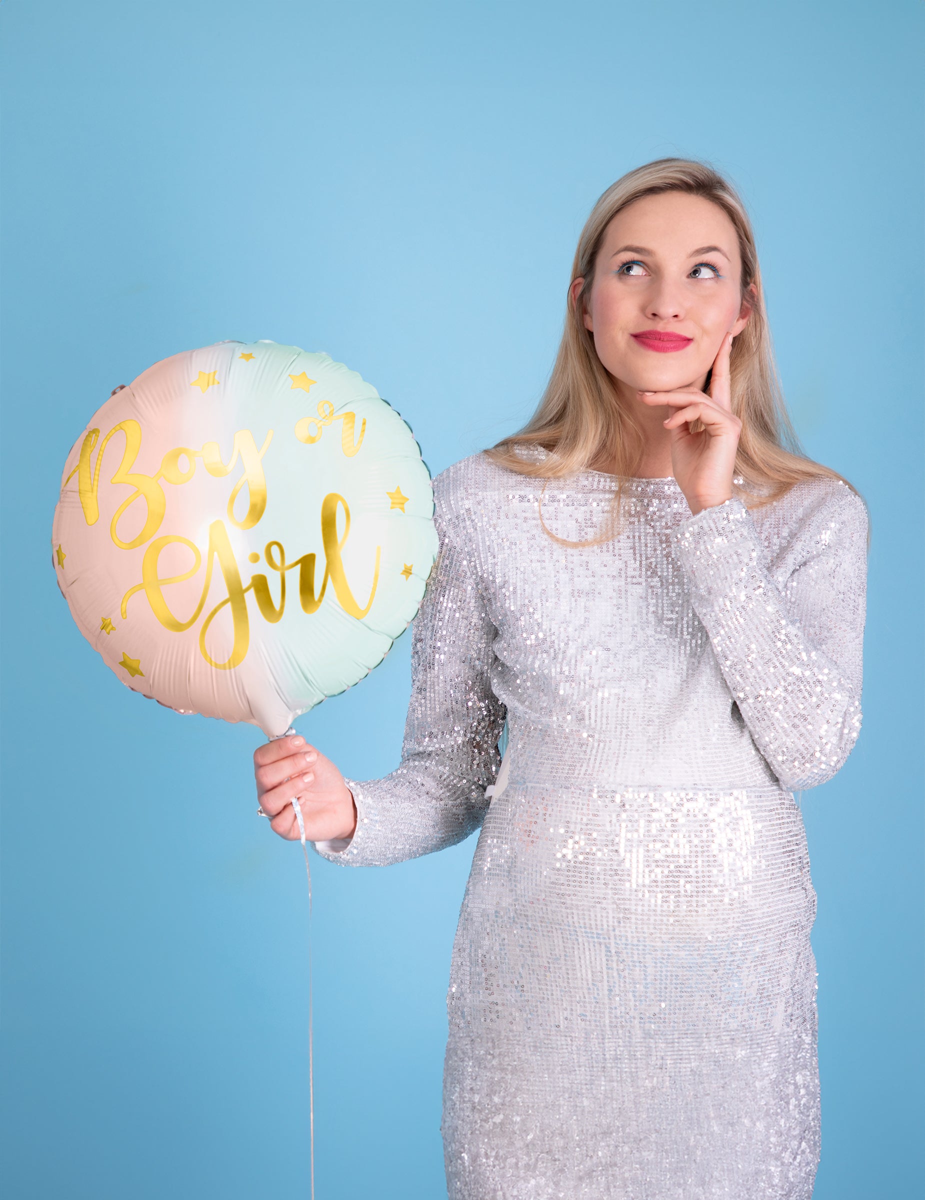 Toto lopta kovový má priemer približne 35 cm. V jemných odtieňoch ružovej a pastelovej modrej vyjadruje posolstvo „... chlapec alebo dievča „napísané zlatými písmenami. Tento doplnok je ideálny na vylepšenie atmosféry vášho párty s odhalením pohlavia vďaka tomuto veľkolepému pastelový balón !
