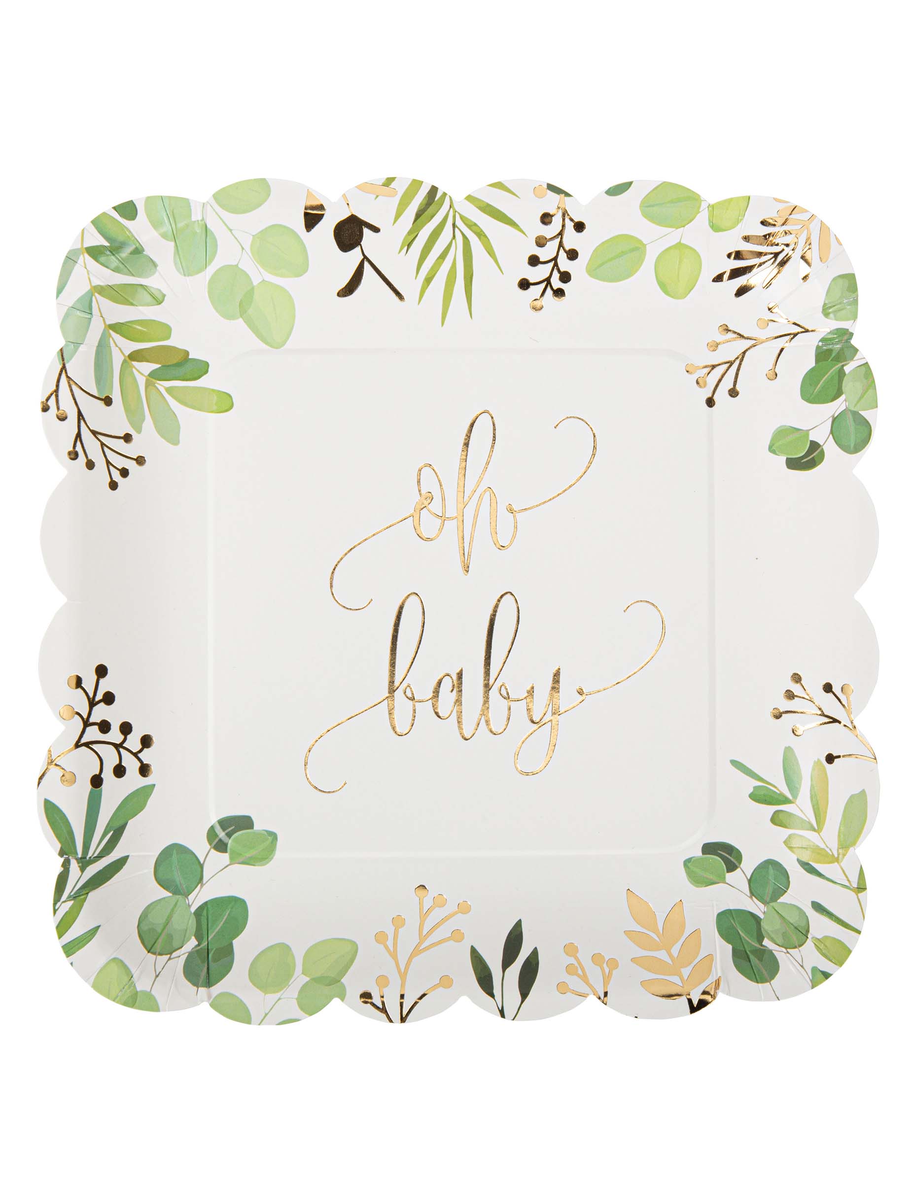 Dodajte svojej udalosti nádych sladkosti s touto sadou 8 kusov taniere kartónové štvorce po 23 kusoch cm. Majú elegantný dizajn a vyznačujú sa vrúbkovanými okrajmi zdobenými motívmi zelených a zlatých listov. V strede je jemne vyrytý nápis „oh baby“ zlatým písmom na čisto bielom pozadí. zeleninové taniere sú ideálnym doplnkom na vylepšenie stola detská oslava O prírodná téma a šik.