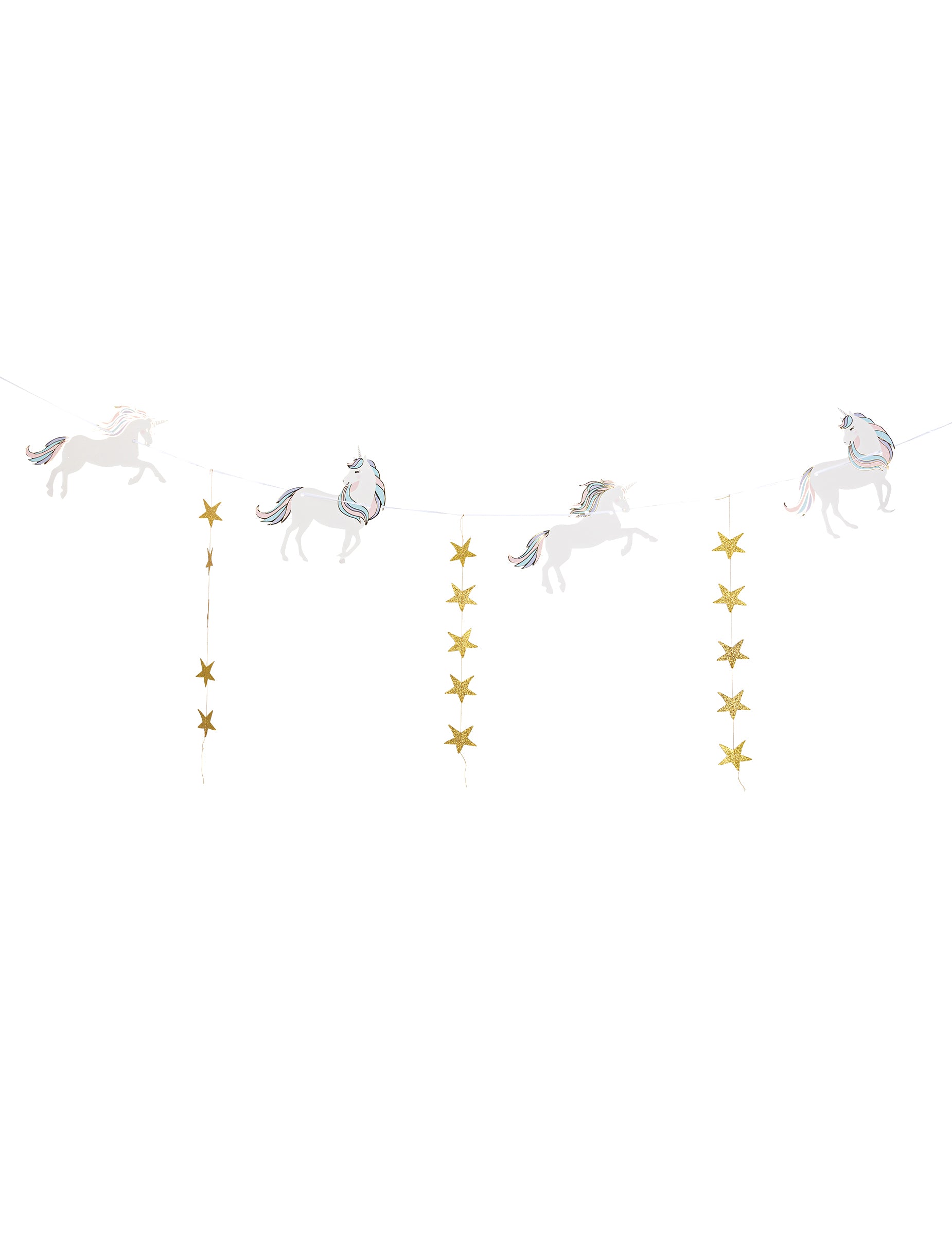 Skladá sa z nádherných siluet jednorožce v pastelových odtieňoch, striedavo s visiacimi trblietavými zlatými hviezdičkami.