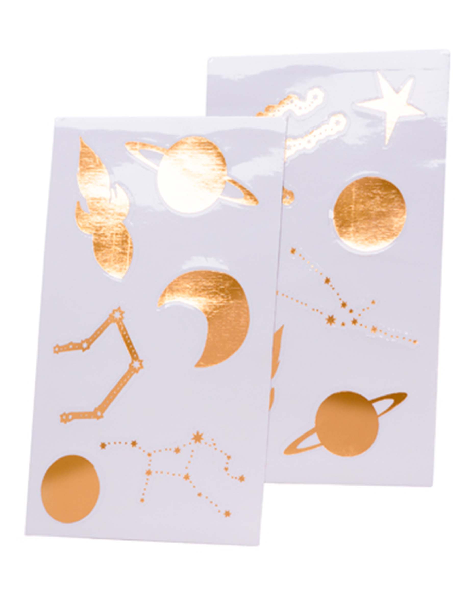 Dodajte svojej párty galaktický nádych s touto sadou 12 kusov nálepky s rozmermi od 3 do 7 cm. Ozdobený vynikajúcim vzory priestoru Rovnako ako súhvezdia a hviezdy, sú ideálne na ozdobenie vašich darčekov alebo pozvánok. zlaté nálepky premení vaše príslušenstvo počas narodeniny vo vesmíre nezabudnuteľné.