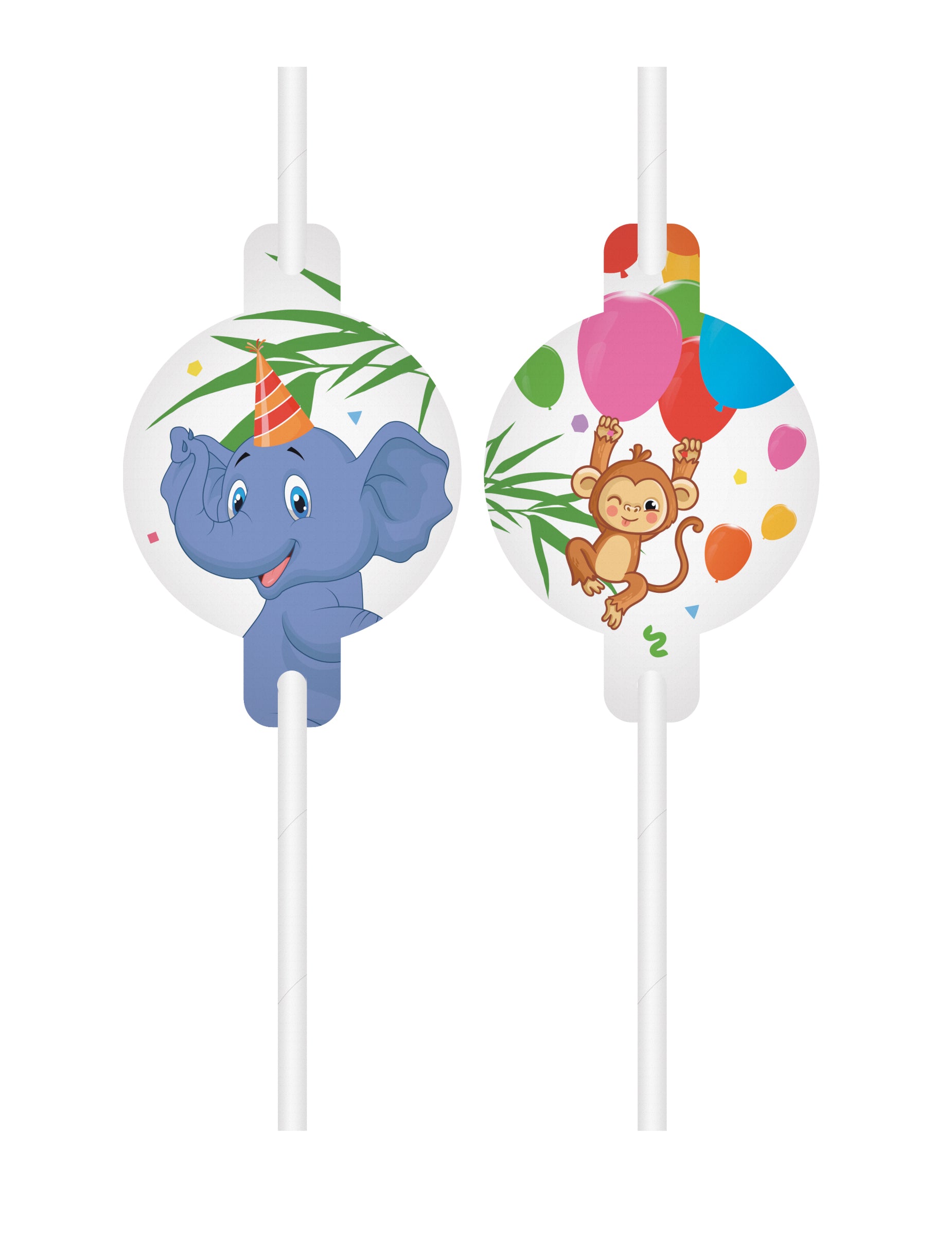 Táto sada pozostáva zo 4 slamky na medailóny vyrobené z bieleho kartónu. Sú ozdobené malými vinetkami znázorňujúcimi slon ako aj opica uprostred tropických vzorov a viacfarebných balónov. Tieto slamky sú ideálne na vylepšenie výzdoby stola narodeninová oslava na téma safari džungle.