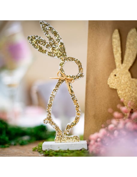 Králik na bielom drevenom podstavci so zlatými trblietkami 18 cm na Veľkú noc
