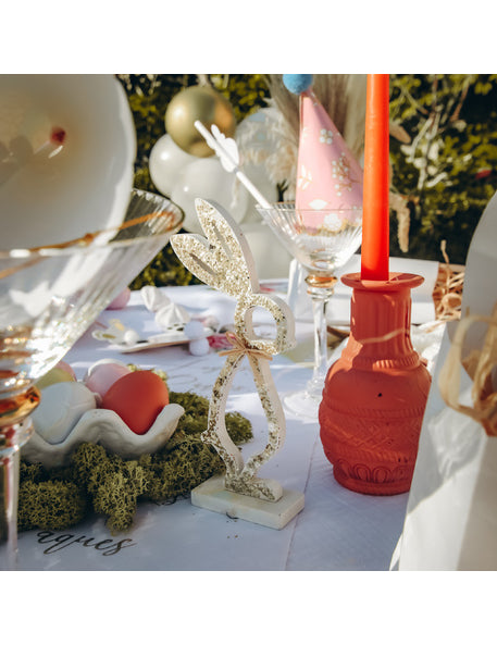 Dodajte svojmu interiéru nádych jemnosti s týmto dekorácia vyrobené z dreva, vysoké 18 metrov cm. Toto pekné králik Biela je ozdobená zlatými trblietkami a elegantnou rafiovou mašľou pre prirodzený vzhľad. králik na podstavci bude ideálnym stredobodom stola Veľká noc s eleganciou.