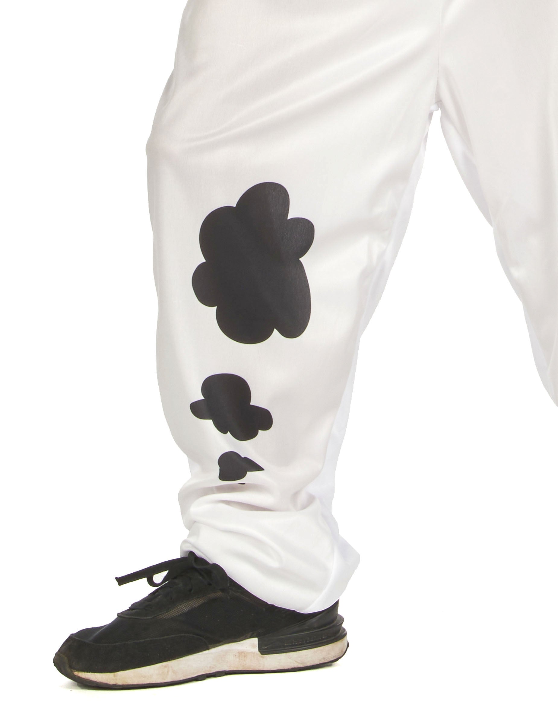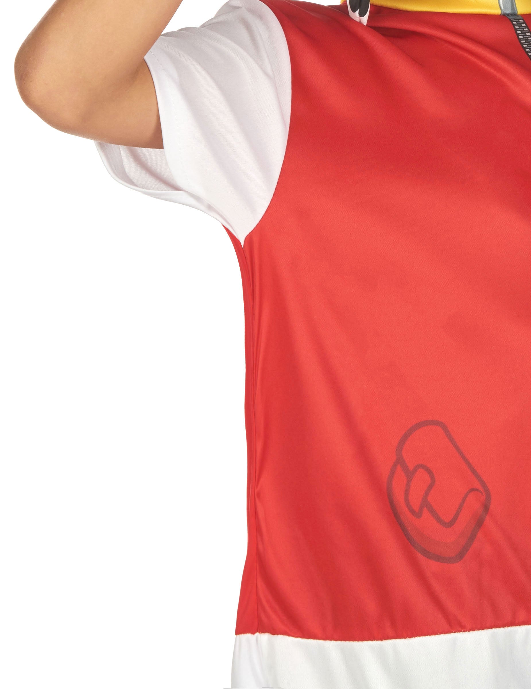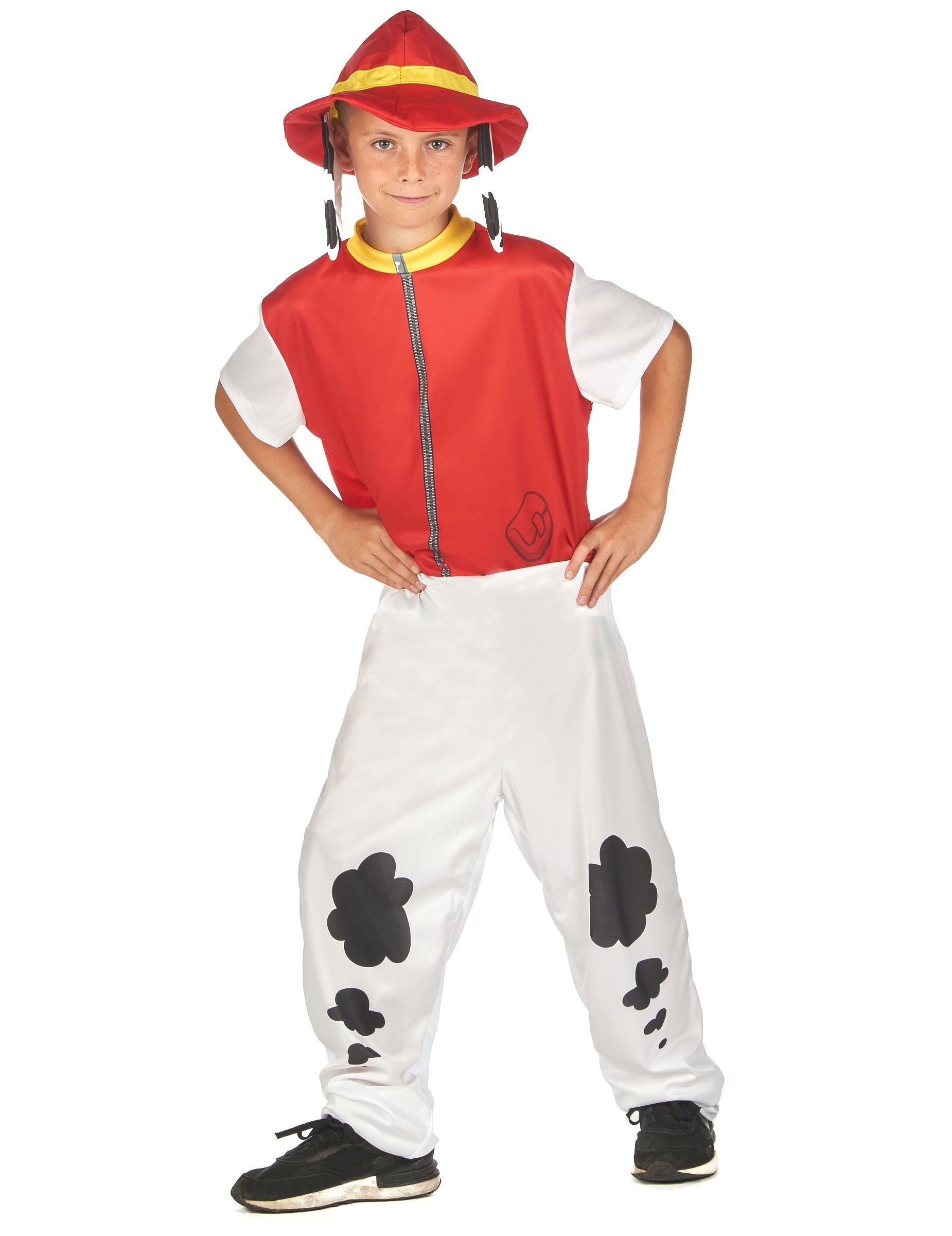Overal s krátkymi rukávmi je červenej farby od pása hore a bielej farby na nohách, doplnený o čierne škvrny a falošný chvost.