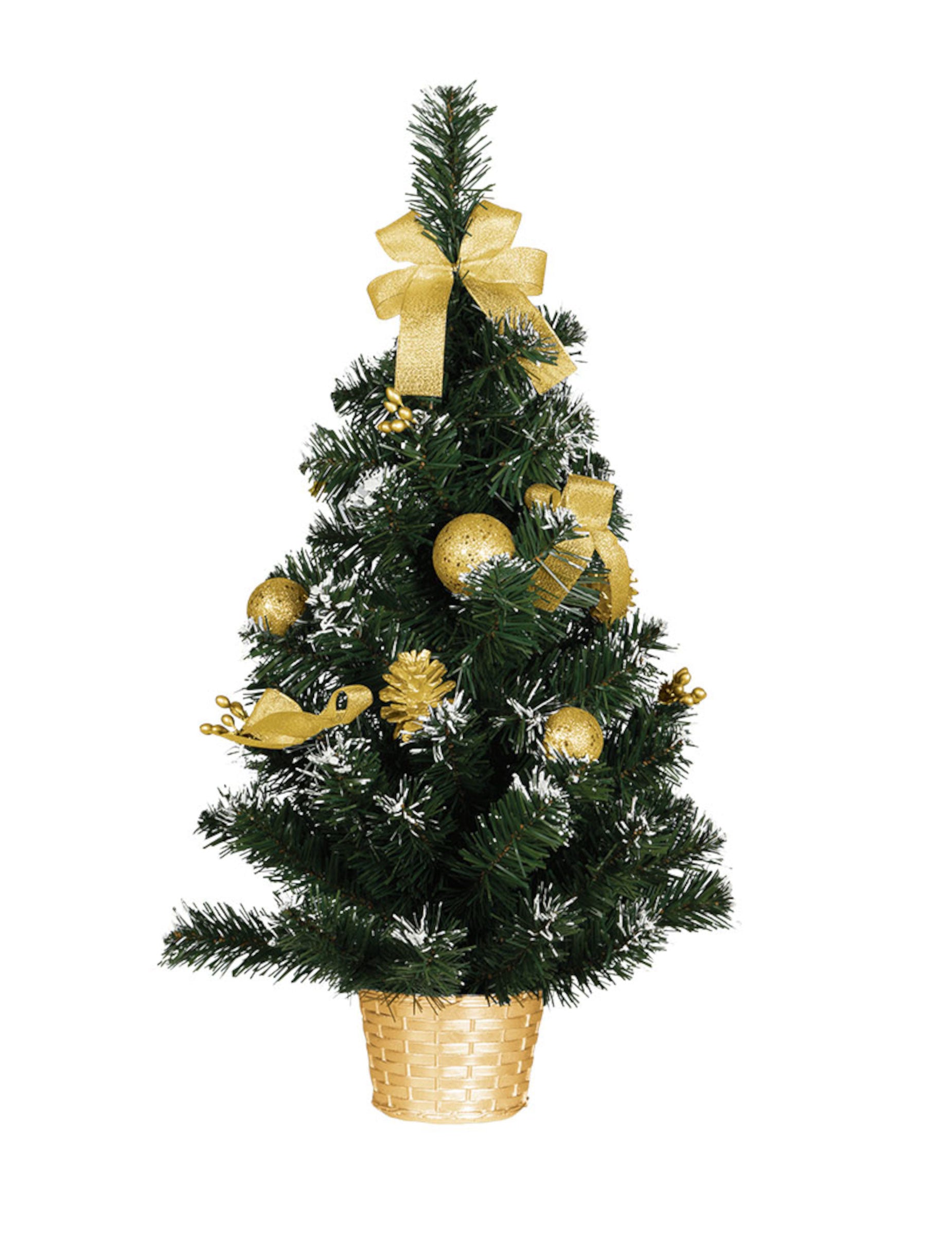 S výškou 60 cm, Toto umelý vianočný stromček Má odtiene zelenej a zlatej. Je umiestnený v priloženej zlatej nádobe, ozdobený ozdôbkami, šiškami a elegantnými mašľami. Končeky jeho konárov sú jemne natreté bielou farbou, aby simulovali zasnežený vzhľad. jedľa je ideálny na vylepšenie vašich sviatočných dekorácií Vianoce.