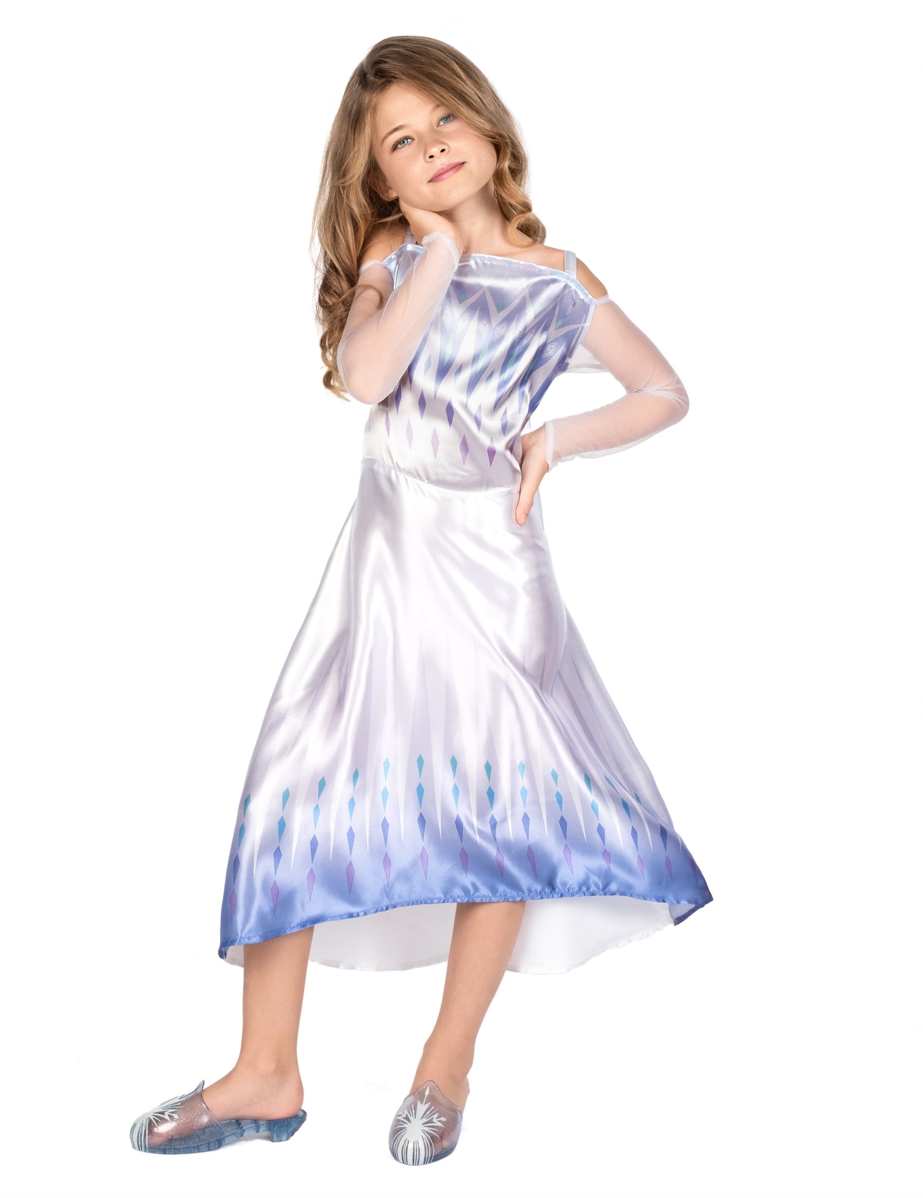 Šaty sú kostýmom slávnej Kráľovná ArendelleJe biela s modrými podtónmi a zdobí ju diamantová potlač na vrchnej a spodnej časti. Rukávy sú dlhé a vyrobené z jemného modrého tylu.
