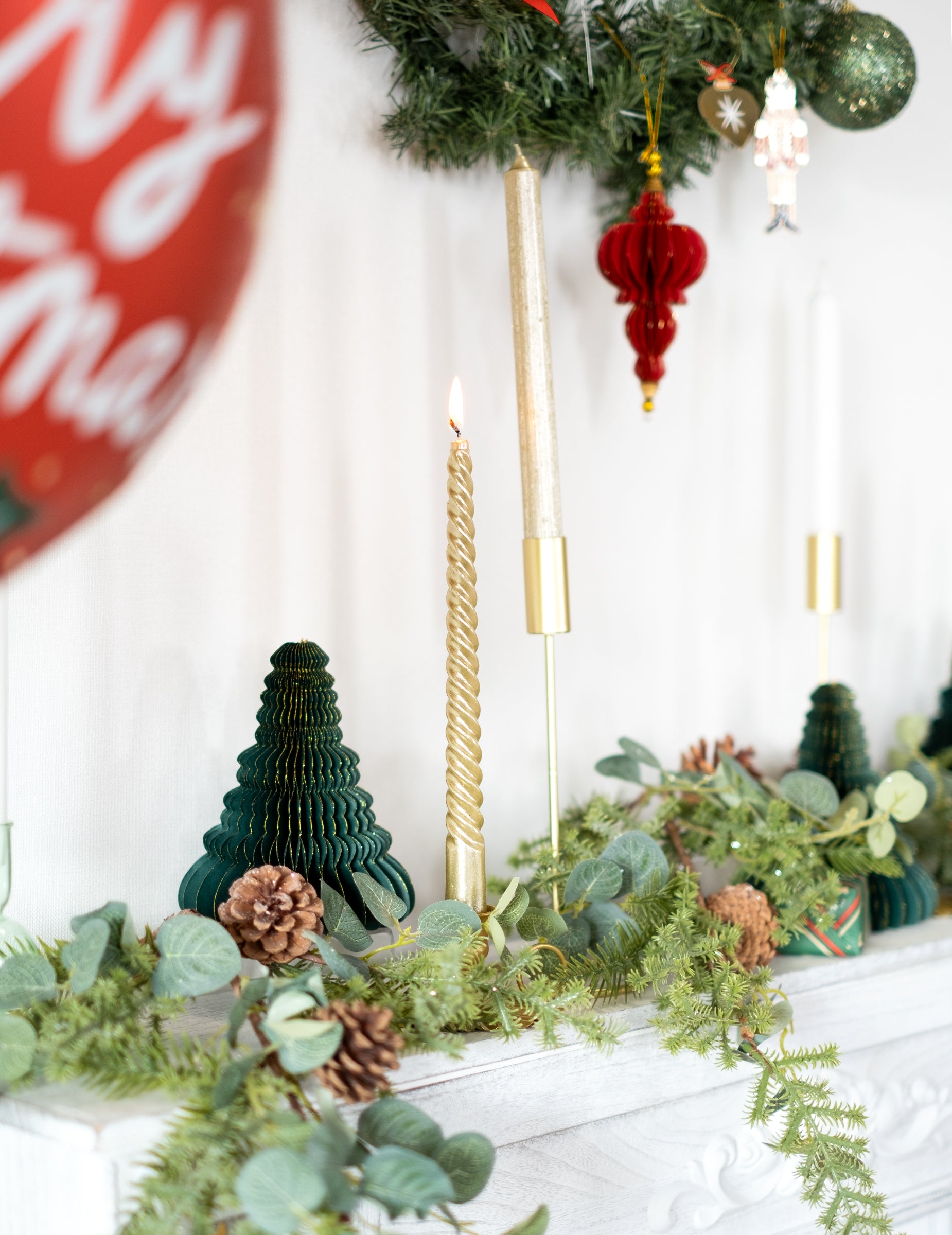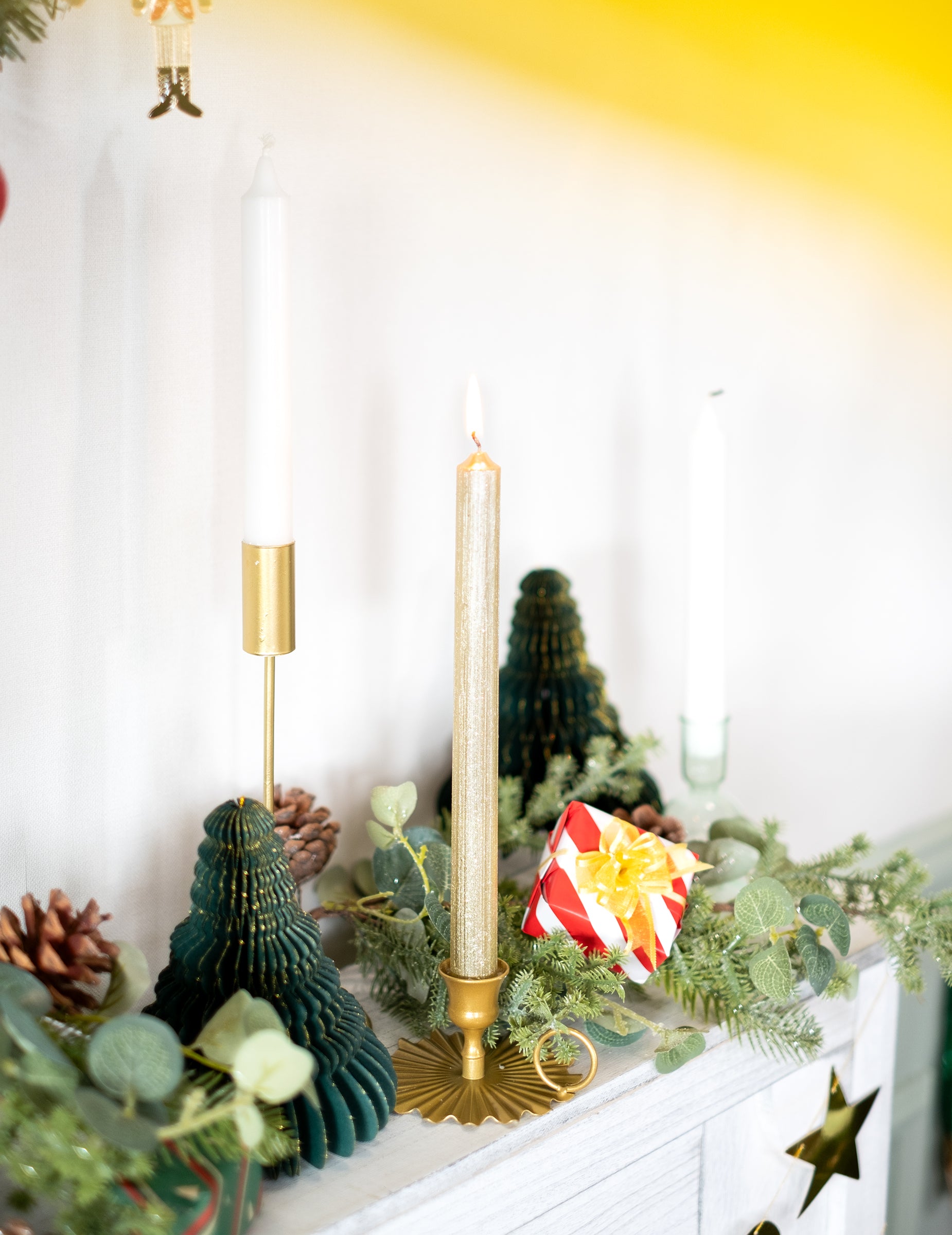 Táto sada obsahuje 4 sviečky vo vosku, výška 25 cm cm na osvetlenie vašich osláv. Sada obsahuje 2 tradičné valcovité sviečky a 2 originálne skrútené modely. Všetky sú odeté v inej farbe. zlato šumivé a trblietky Sú jemné. Dodajú vášmu interiéru nádych luxusu. Vianoce alebo na podujatí na elegantná téma .