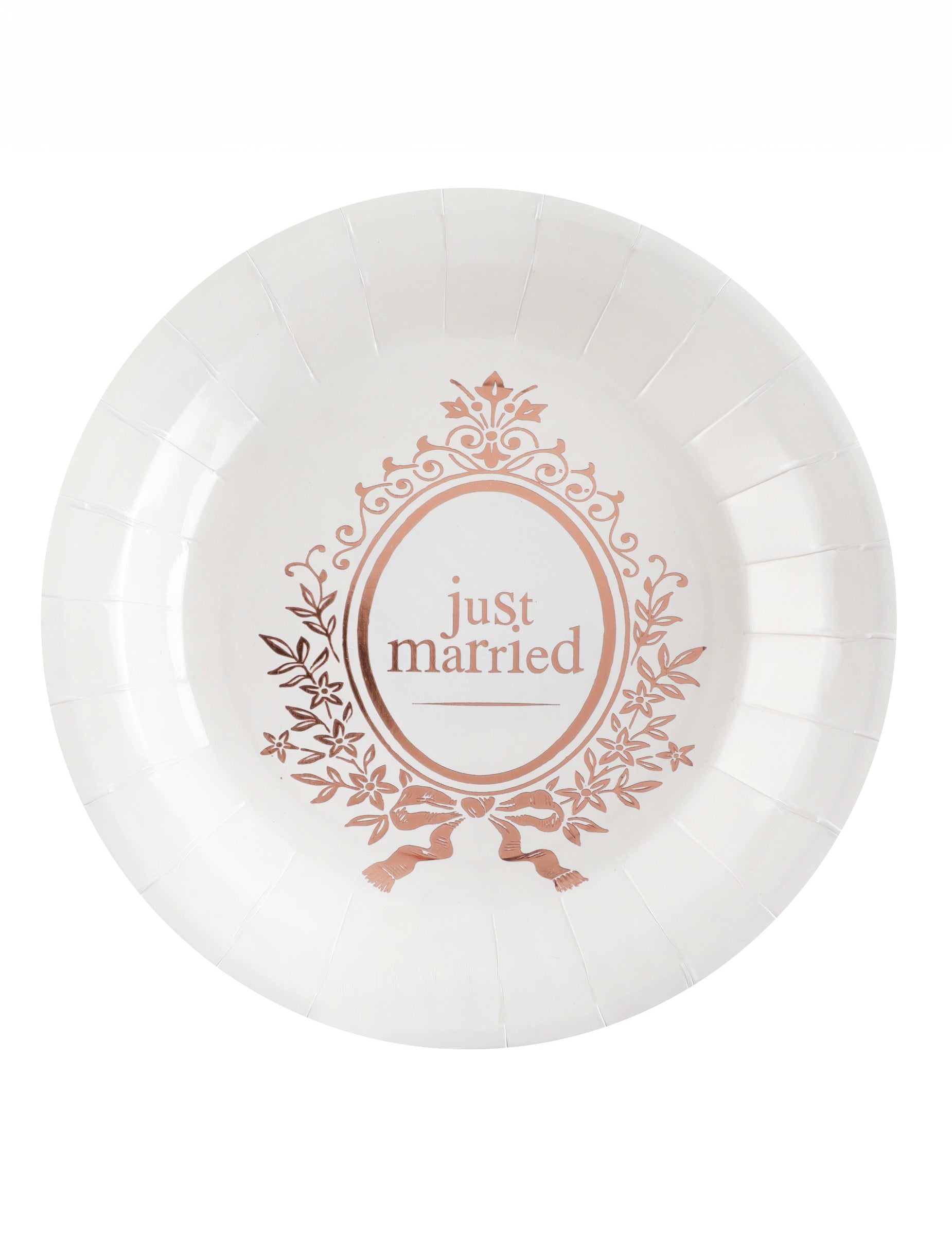 10 bielych a ružovo-zlatých kartónových tanierov s nápisom „Just Married“ 23 cm pre elegantnú svadbu