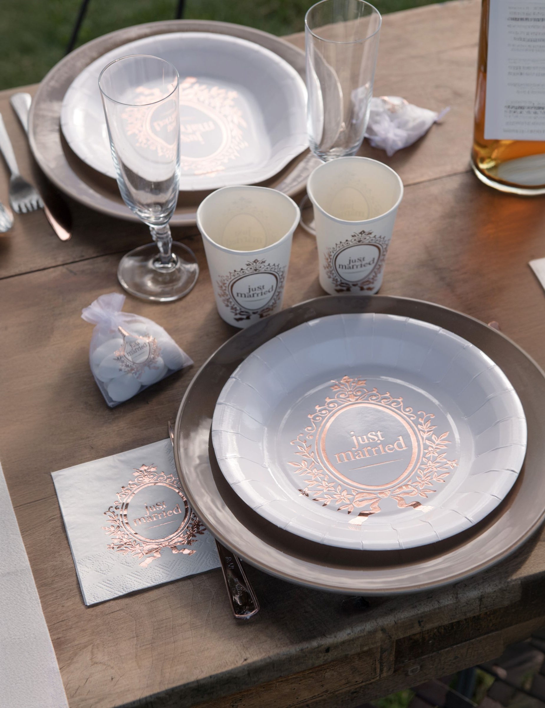Pripravte si nezabudnuteľnú hostinu s touto sadou 10 kusov kartónové taniere z 23 cm v priemere. Ideálne na oslavu vášho zväzku, tieto taniere z ružového zlata a biela dodá vášmu interiéru elegantný nádych svadobný riadKaždý kus je ozdobený nápisom „práve zosobášený/á„umocnené jemnými arabeskami a kvetinovými motívmi. Pre svadobný stôl Pre harmonický vzhľad ich pokojne zlaďte s pohármi a obrúskami z rovnakej kolekcie. Či už na jednoduchom obruse alebo drevenom stole, tieto Riad pre novomanželov zlepší vaše svadba z ružového zlata s elegantným a romantickým nádychom.