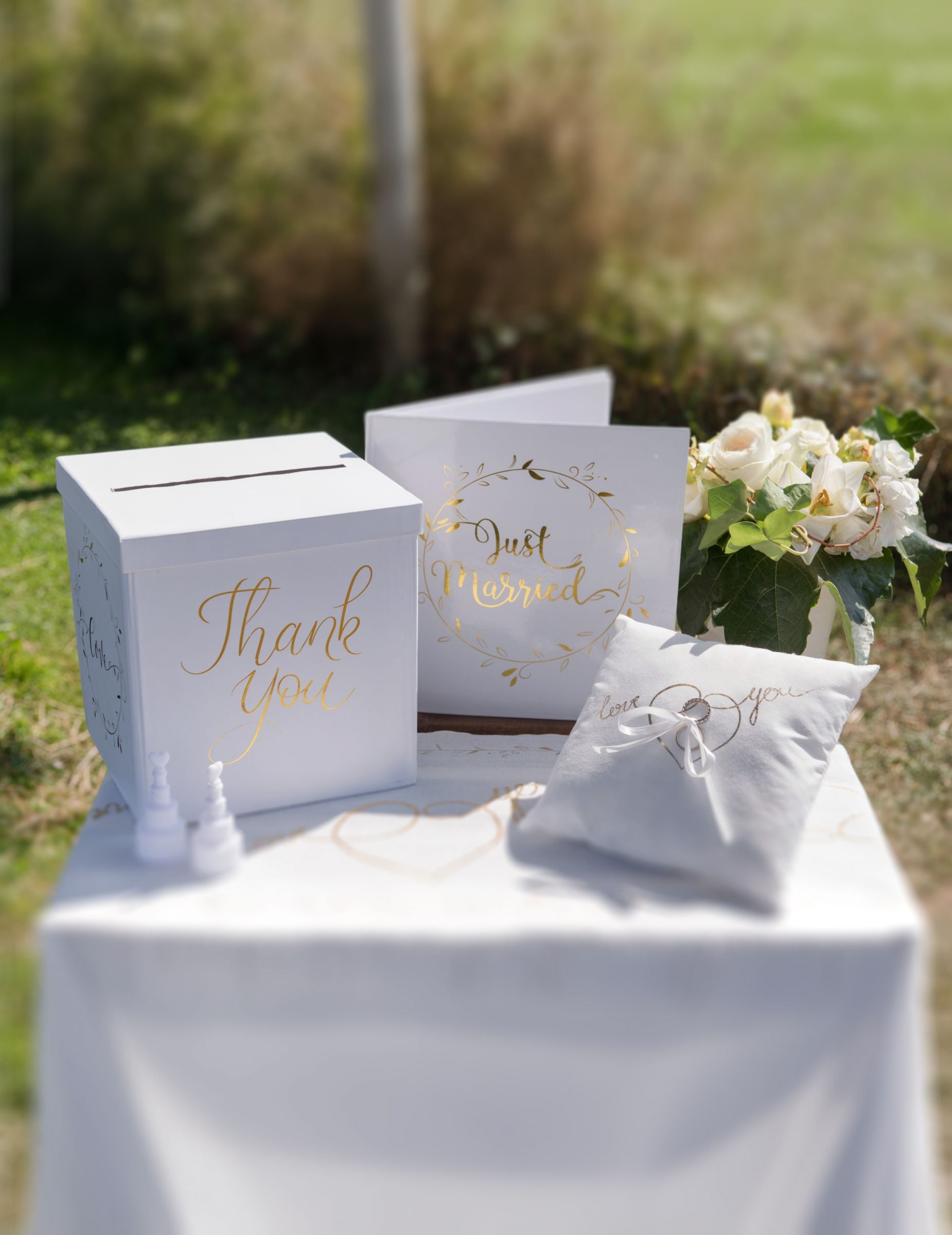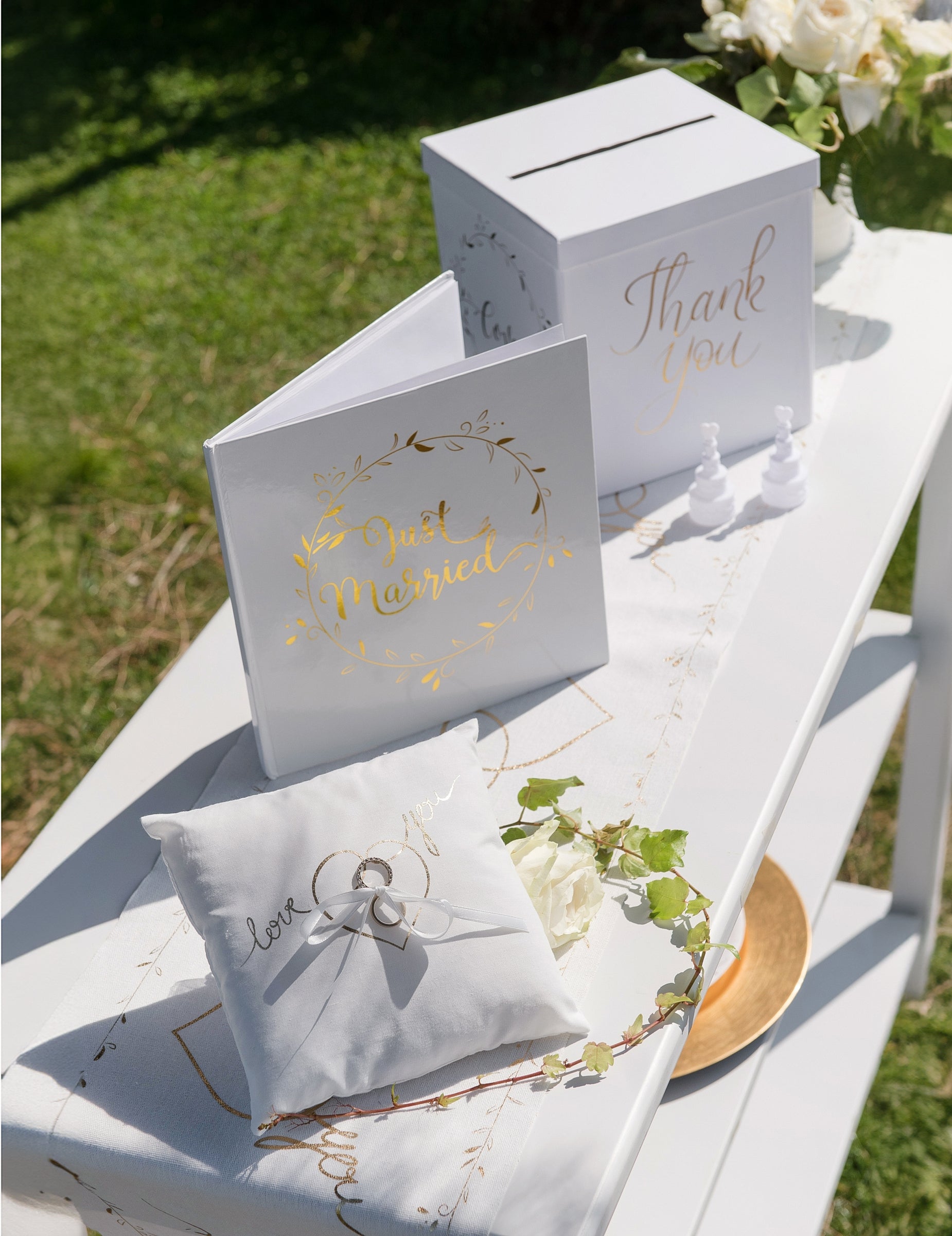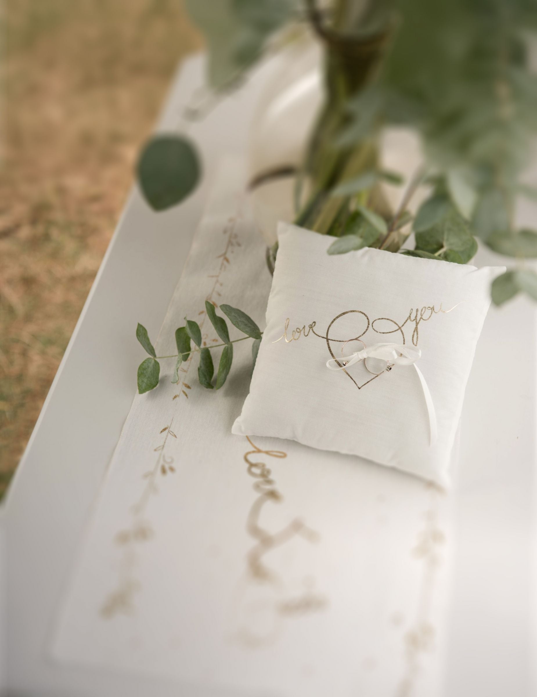 D'une dimension de 18 x 18 cm, ce coussin pour alliances est conçu en coton blanc pur. Il arbore un motif élégant où les mots « love you » dessinent un cœur doré scintillant. Un délicat ruban en satin blanc placé au milieu permet de fixer solidement vos anneaux.