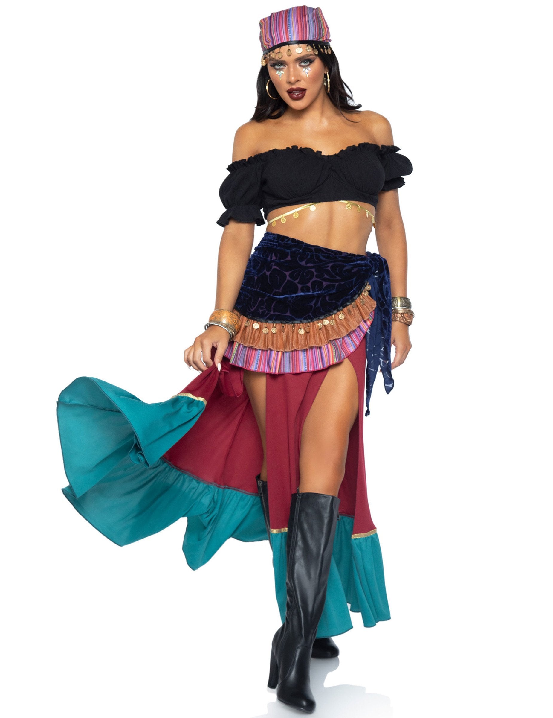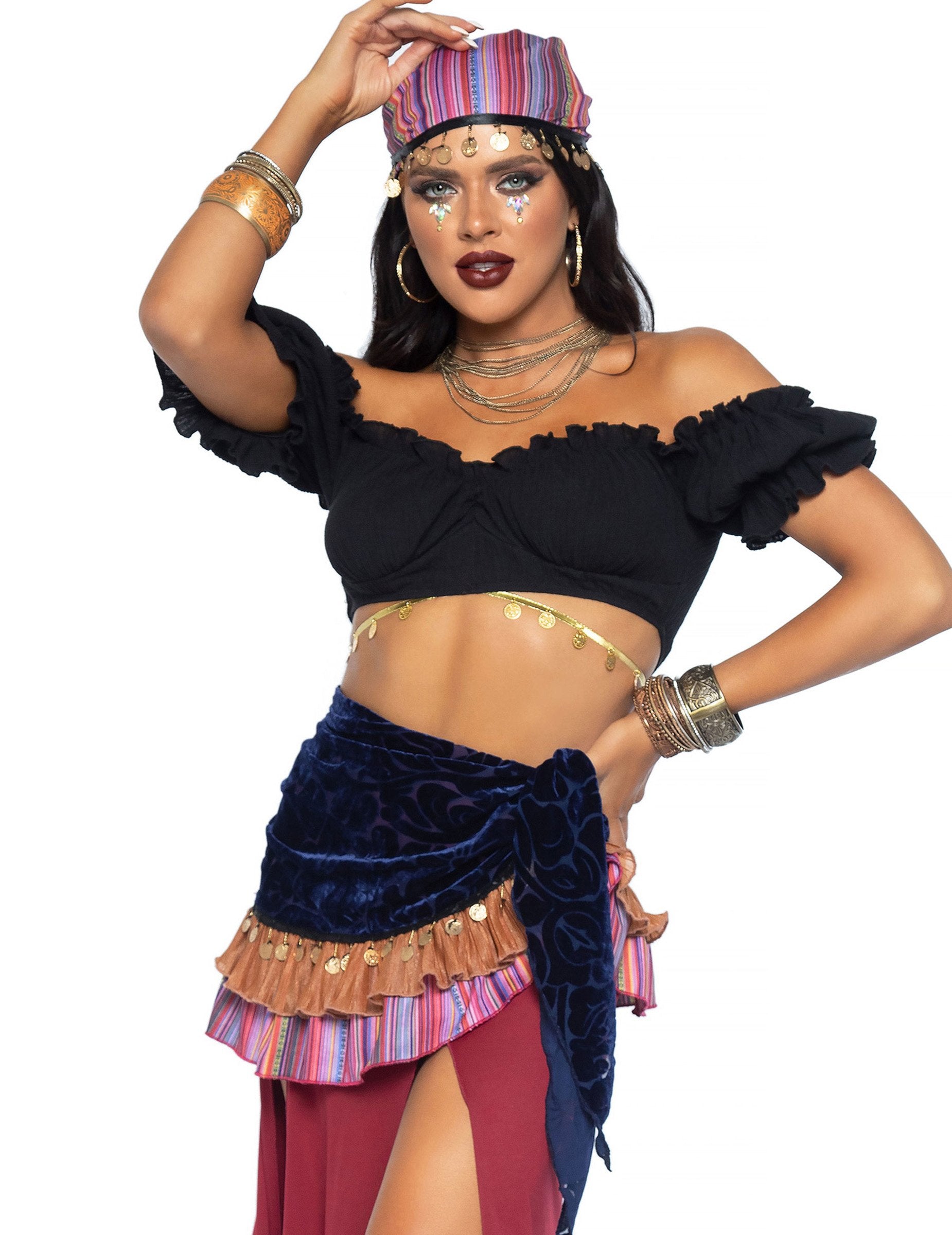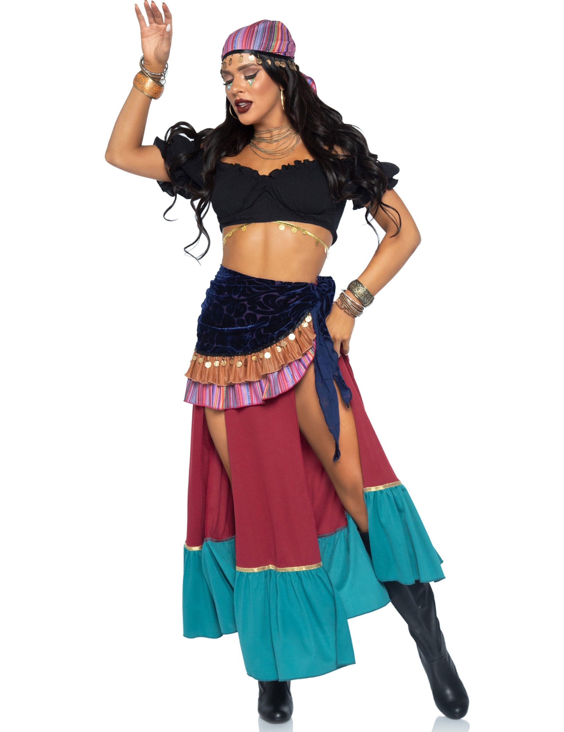 Tento luxusný bohémsky kostým je určený pre ženy. Obsahuje crop top, sukňu so šatkou a čelenku.