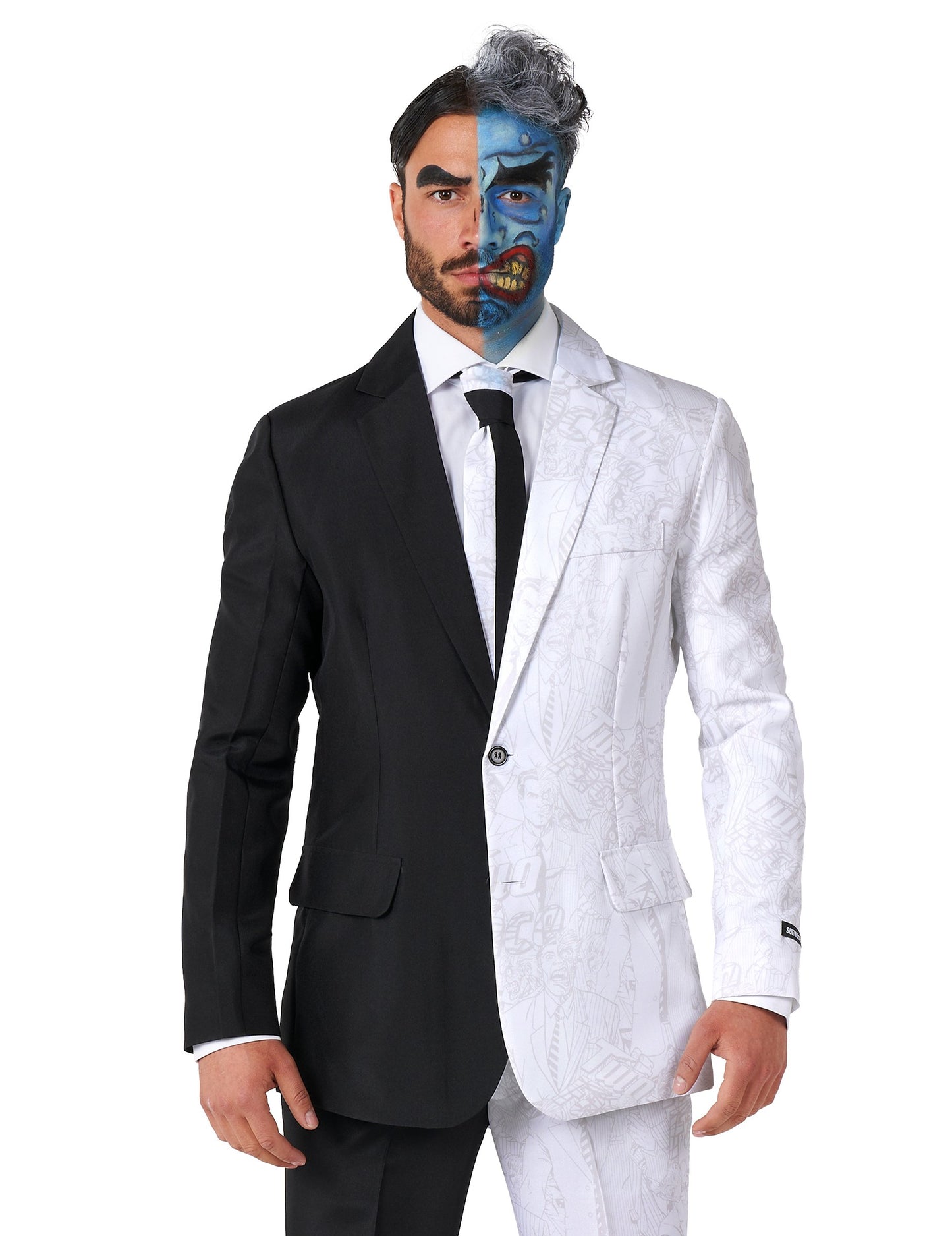 Toto dvojité maskovanie pre dospelých je na oficiálnom licencii na sledovanie. Zahŕňa bundu, nohavice a kravatu. Kostýmová bunda má pôvodnú charakteristiku toho, že je v dvoch rôznych farbách: čierna na pravej strane a biela na ľavej strane. Nájdete tiež na ľavej strane na bielych vzoroch prívesu Jokera. Nohavice a kravata majú rovnaké vlastnosti ako kostýmová bunda. Tento dvojitý kostým bude ideálny na zdokonalenie vášho večera Halloween alebo karnevalu!
