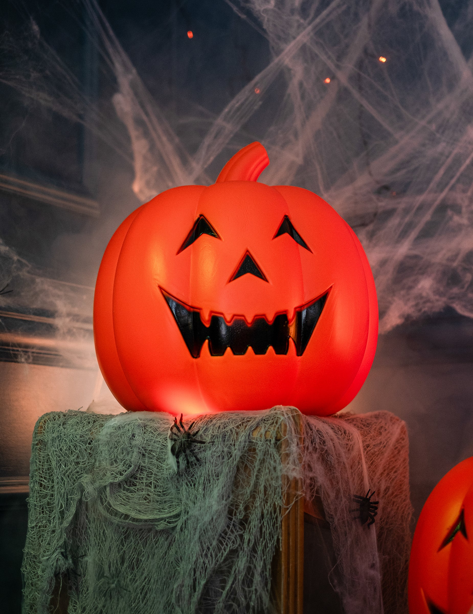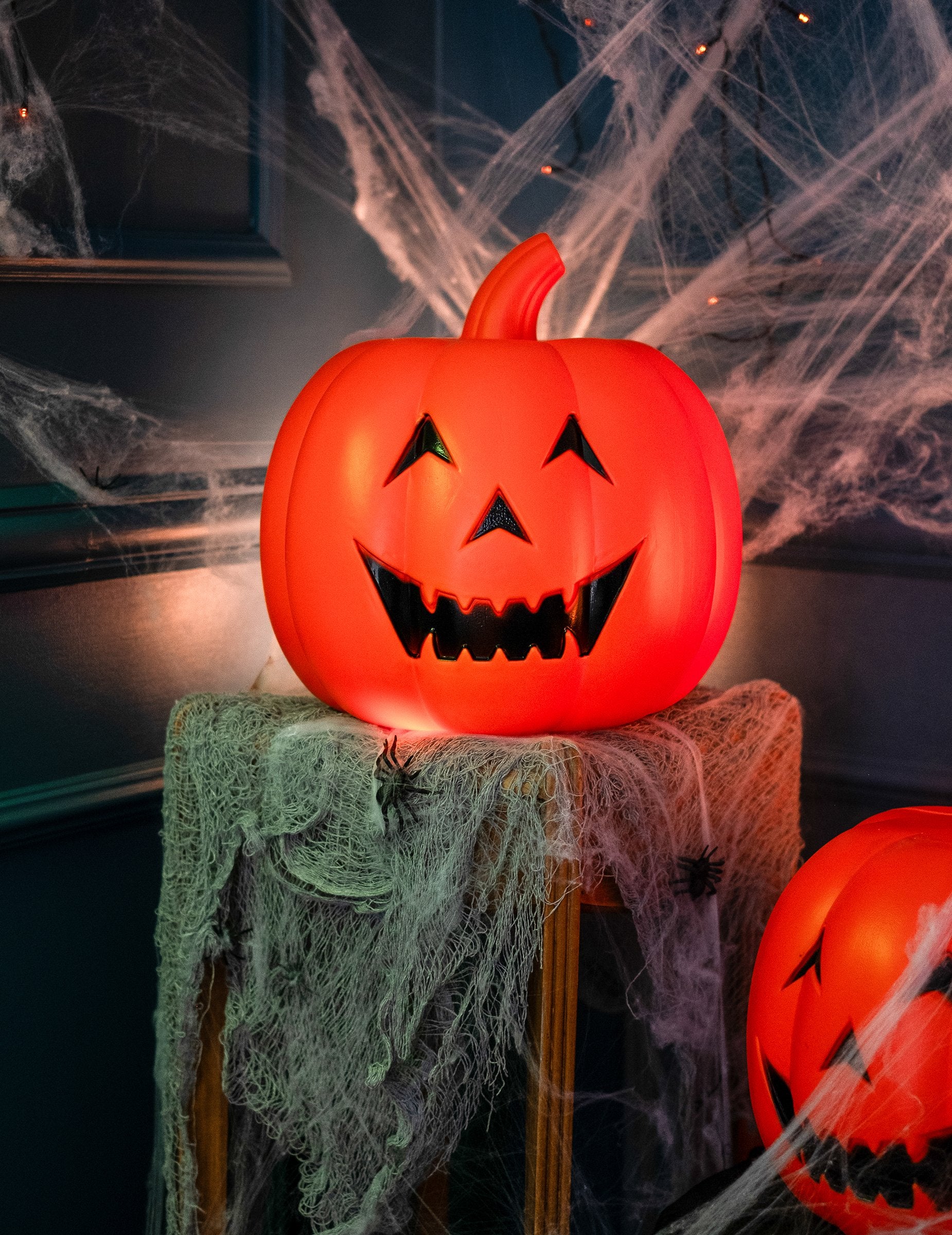 Táto tekvica je dekorácia meraním približne 32 cm. Má oranžovú farbu a má úsmev viac ako desivé. Musíte sa len zapnúť, aby ste sa ponorili na desivú atmosféru. Dokončite svoju halloweenskú dekoráciu touto ľahkou tekvicou!