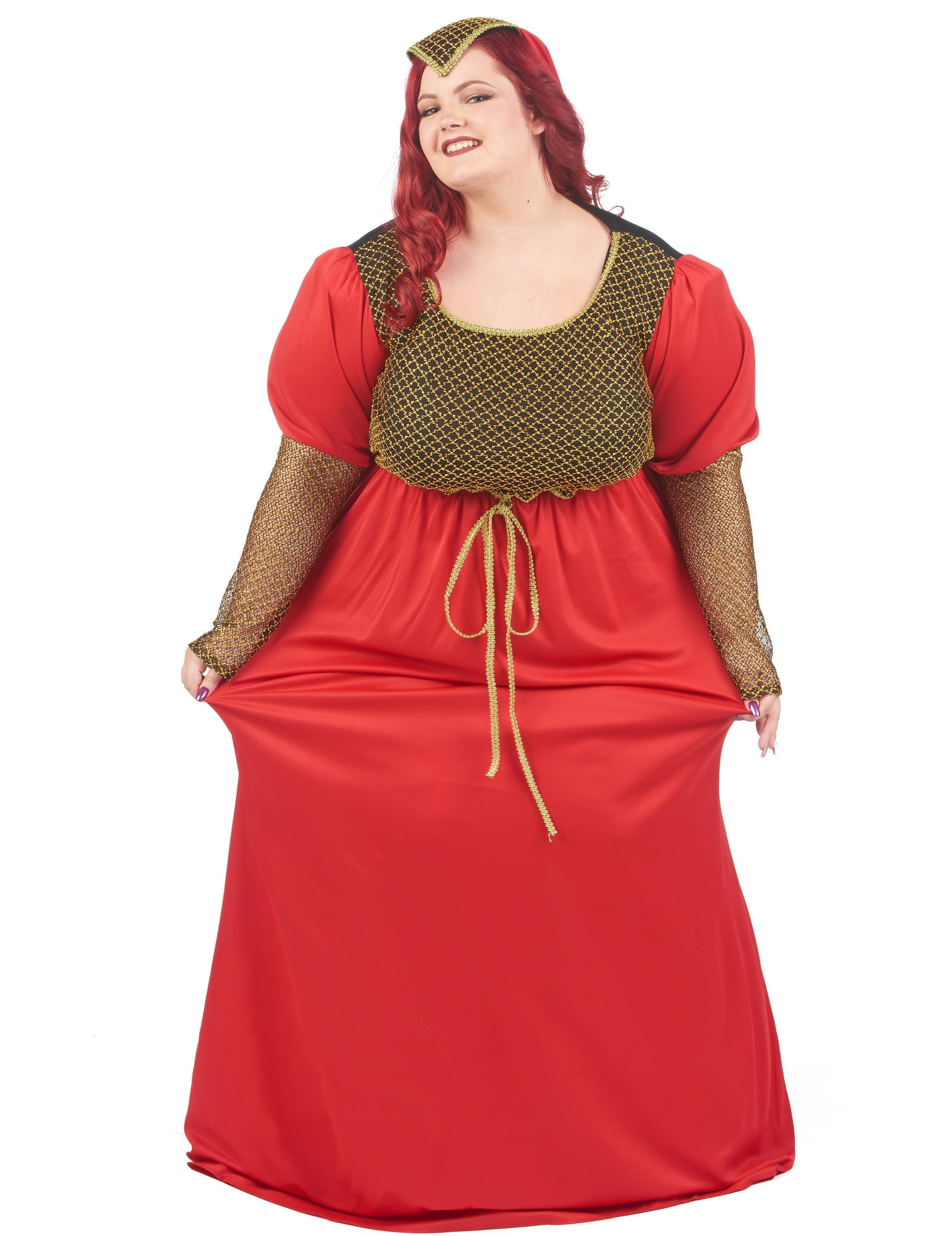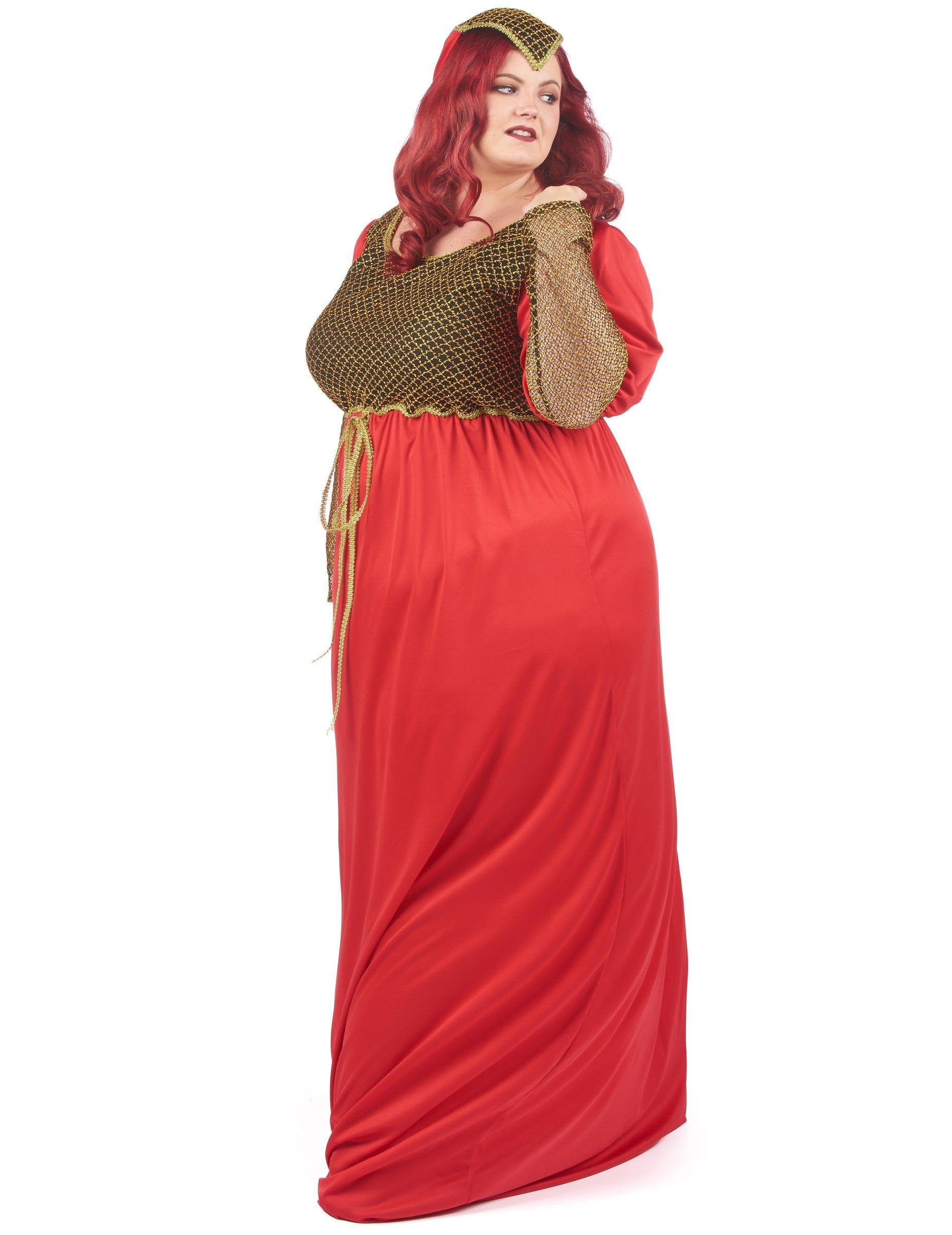 Tento kostým červenej stredovekej červenej veľkosti je určený pre ženy. Skladá sa z šaty a čiapky. Šaty maskovania sú veľmi dlhé s hlavnou farbou pre červenú. Vyznačuje sa svojou nádhernou výšivkou v zlatých a čiernych farbách v rukávoch, ale aj pri poprsie na prednej časti šaty. Šaty sú elastické, pokiaľ ide o veľkosť, čo uľahčí údržbu a pohodlie. Rukávy sú nafúknuté a červené, vybavené epiletami. Pokiaľ ide o pokles čelenky, je priamo pripojená k čiernemu hrebeňu. Nájdete si malý červený závoj, ktorý pôjde dolu na plecia. Toto maskovanie ako stredoveká princezná bude ideálna na zdokonalenie vášho večera na tému karnevalu, pre nový rok alebo pre akúkoľvek inú maskovanú udalosť!