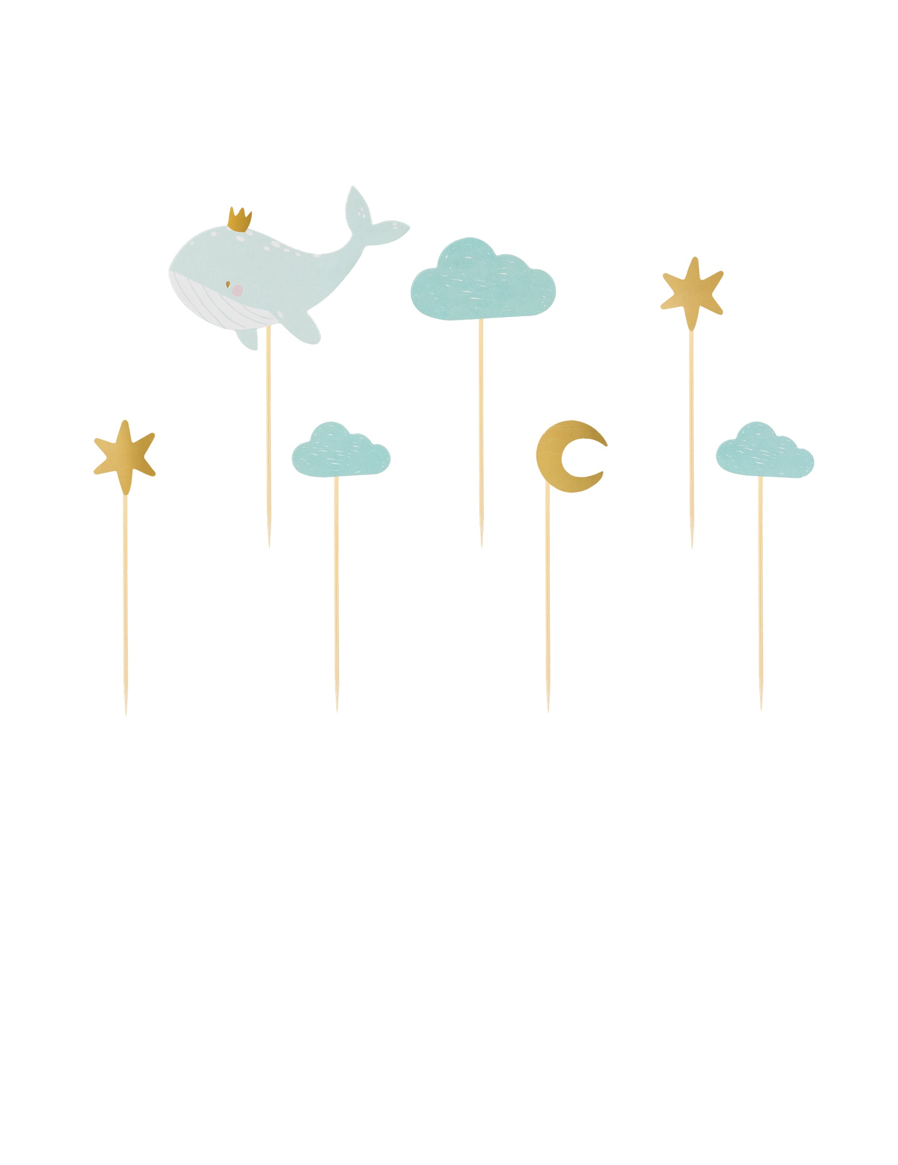 Táto kombinácia modrých a zlatých vzorov obsahuje motívy veľrýb, oblakov a hviezd pre rôzne dekorácie. Tieto prvky sú vybavené drevenými tyčkami a dajú sa veľmi ľahko vložiť do tort.