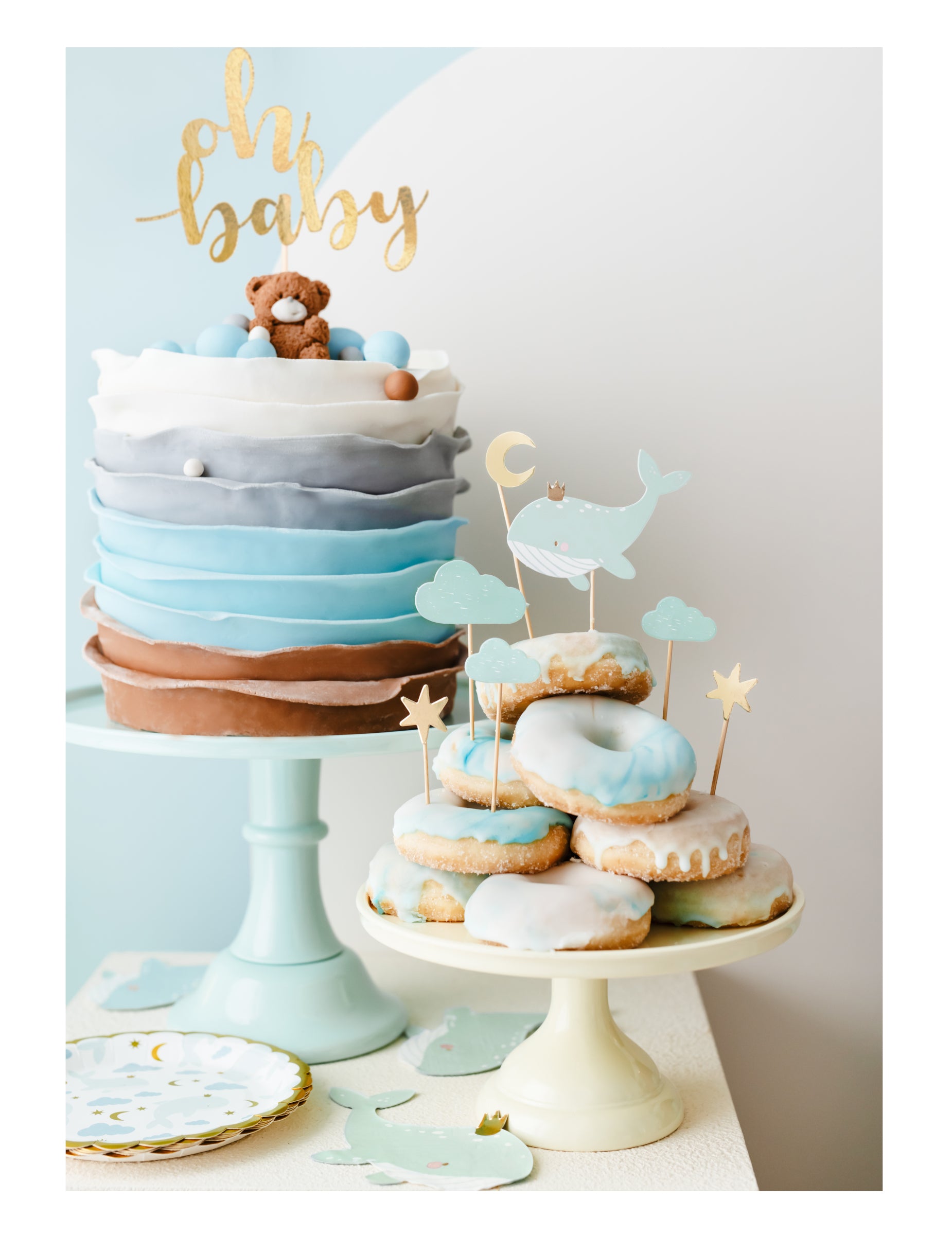 7 ozdob na tortu s motívom nebesky modrej veľryby 11 x 14 cm zlatý oblak