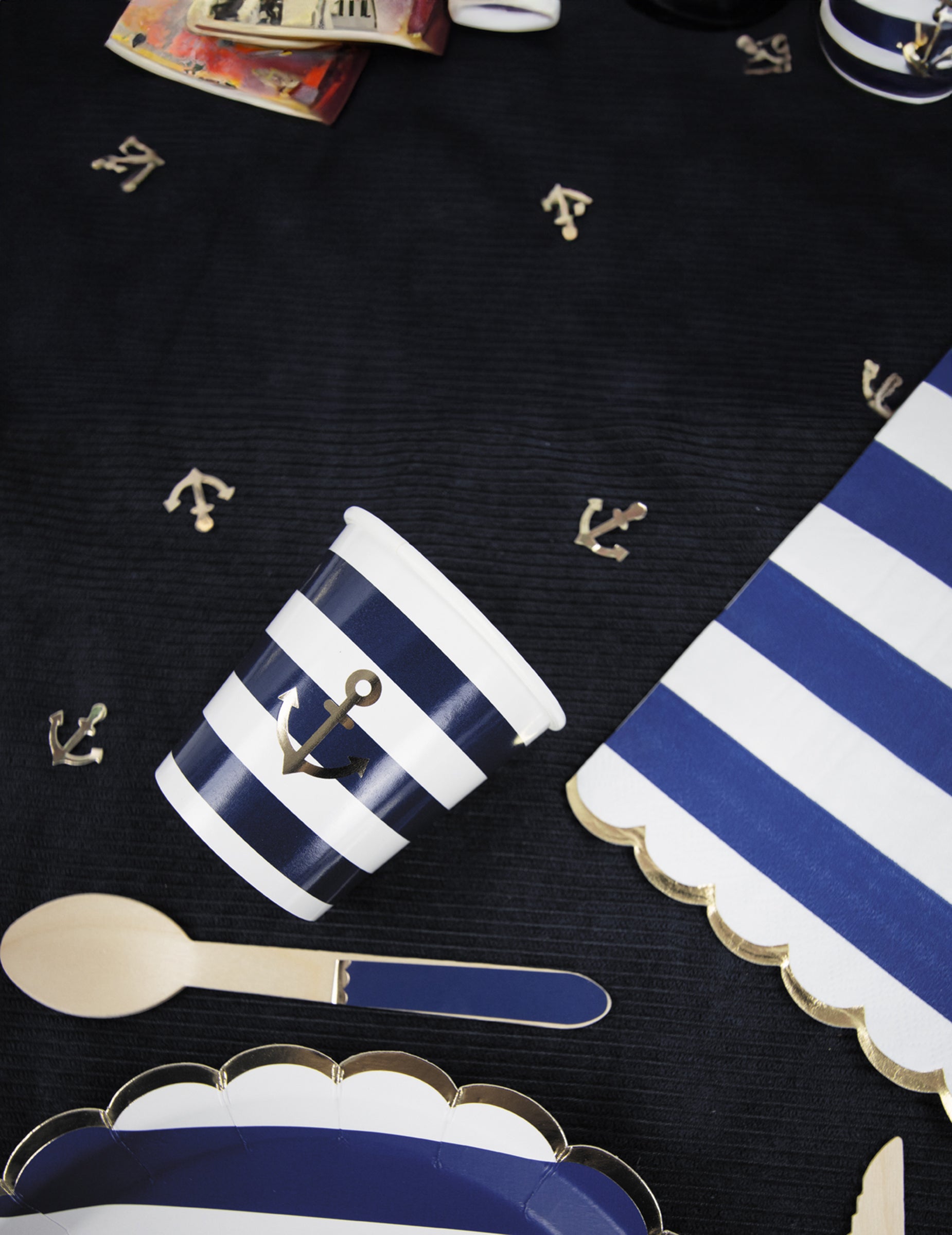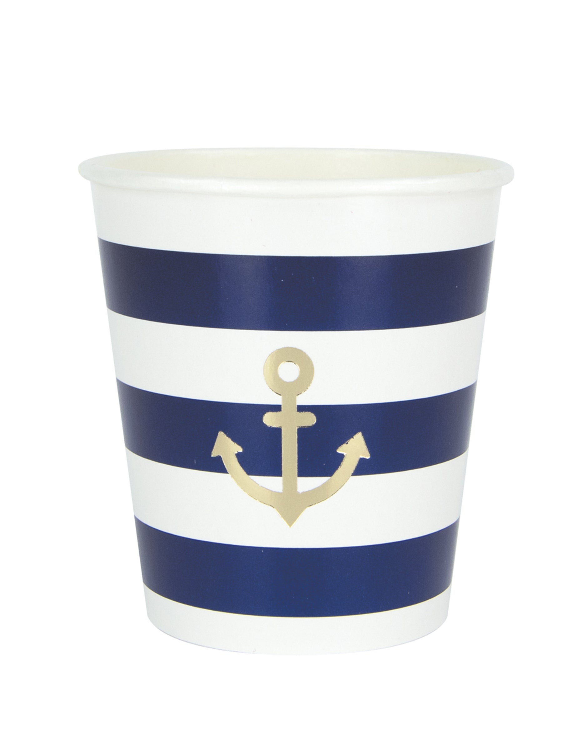 Táto sada obsahuje 8 šálky Jednorazové kartónové nádoby v elegantnom námorníckom štýle. Každá 200 ml nádoba je ozdobená modrými pruhmi a rafinovanou zlatou kotvou. Budú perfektné na ozdobenie vášho stola pri špeciálnej príležitosti. párty s námorníckou tematikou.