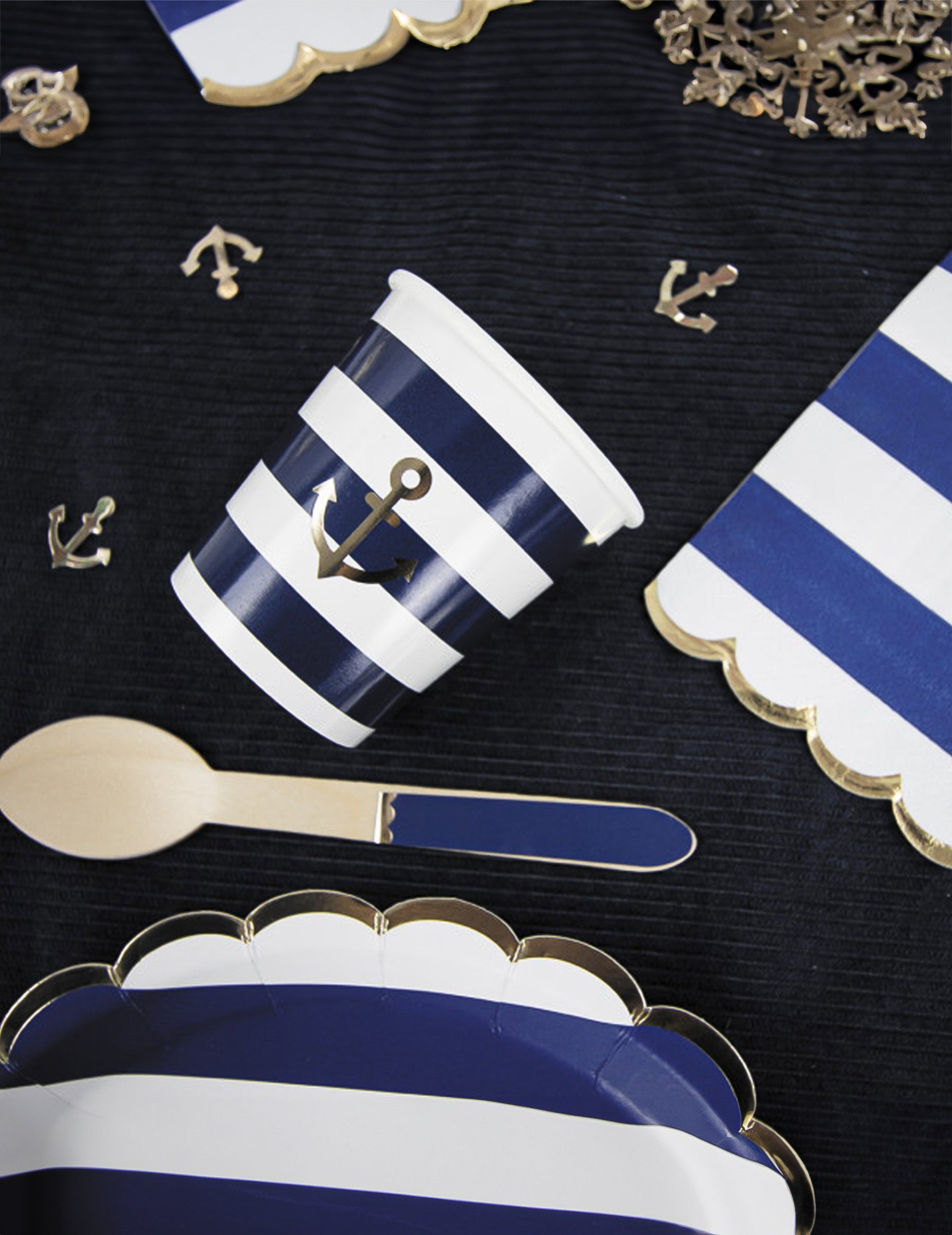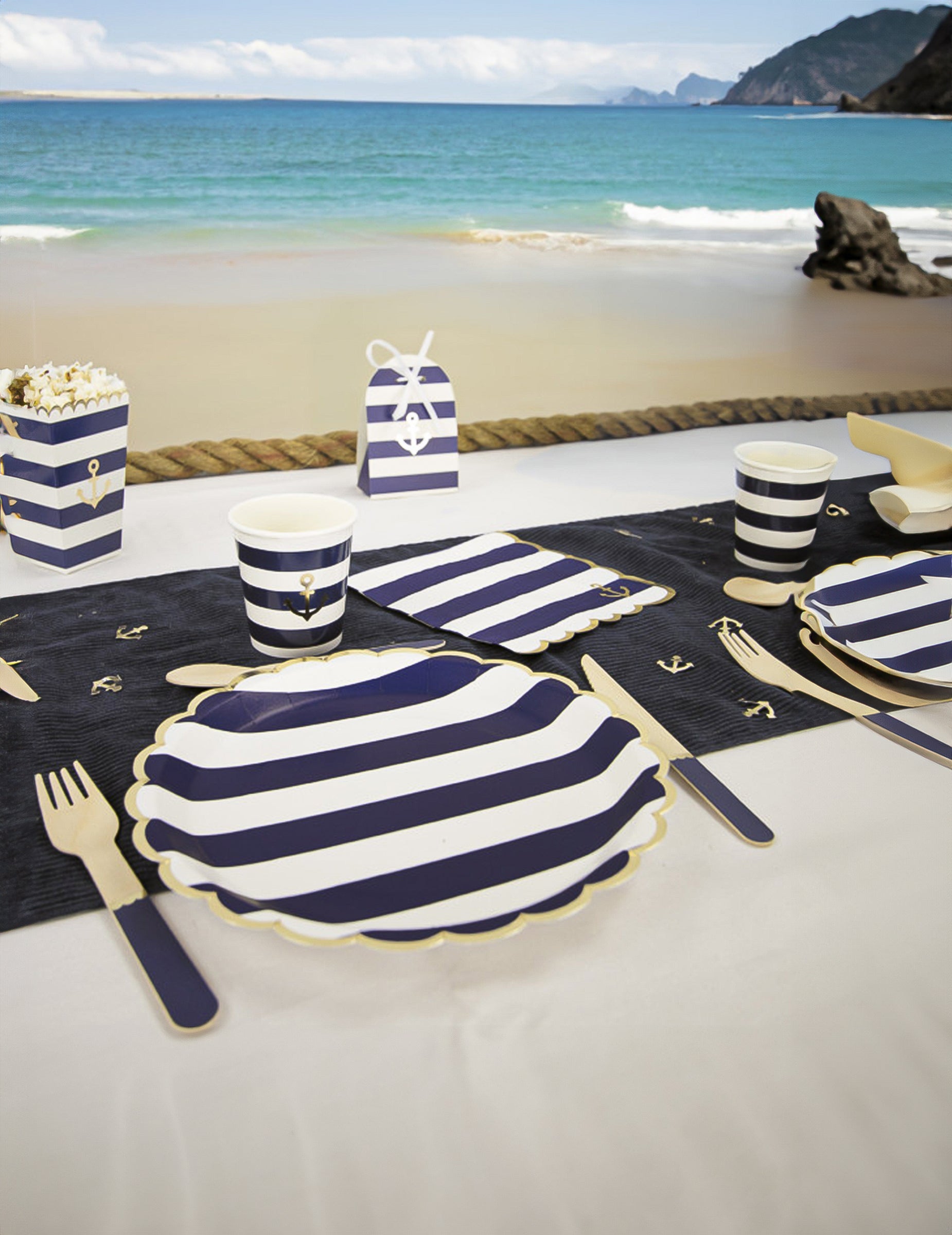 Táto sada obsahuje 16 vrúbkované obrúsky Papierové obrúsky, ideálne na skrášlenie vášho stola. Každý obrúsok má rozmer 33 x 33 cm. cm po rozložení. Dizajn pozostáva z klasických modrých a bielych pruhov, ktoré sú zvýraznené elegantným zlatým okrajom a malou, trblietavou kotvou. Tieto uteráky v námorníckom štýle Dodajú vašim recepciám elegantný a tematický nádych. Sú ideálne na organizovanie párty s námorníckou tematikou alebo podujatie pri mori.