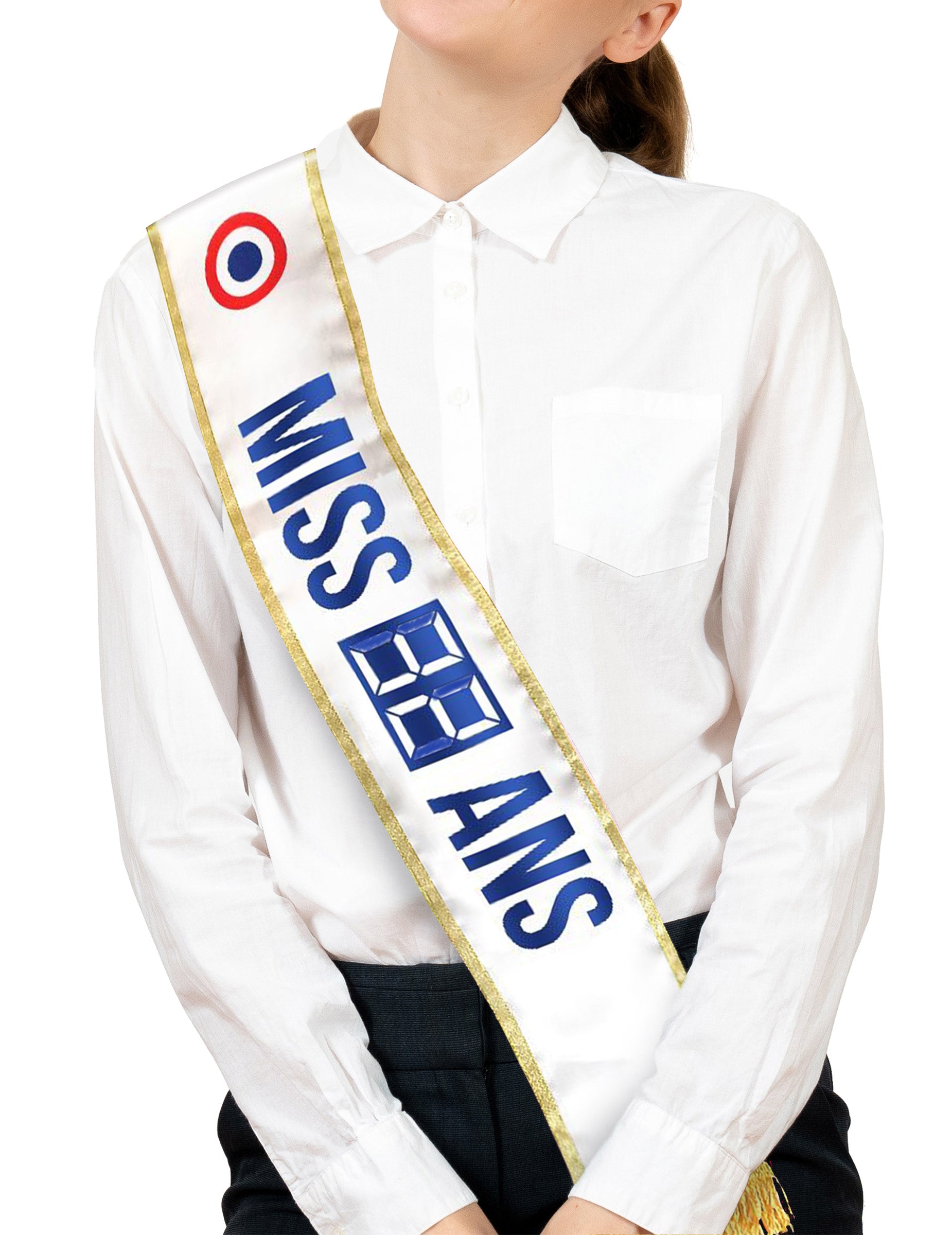 Tento tricolor pre dospelých predstavuje správu „Miss XX rokov“. Zahrnuté sú aj plsť a falošný diplom. Meria 90 cm. Je modrá a červená so zlatými Liséres. Vďaka zahrnutému plsti môžete naplniť šatku počtom podľa vášho výberu. Ideálne na narodeninovú oslavu!