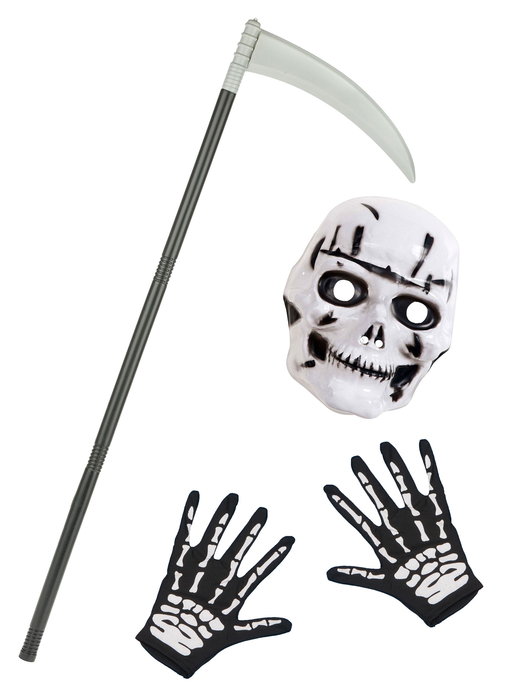 Plastová kosa Táto dlhá kosa meria približne 110 cm. Má čiernu rukoväť a sivú čepeľ pre väčší realizmus. Tento doplnok bude nevyhnutný na stelesnenie skutočného monštra počas vašich maškarných večierkov alebo halloweenskeho večera. Detské čiernobiele rukavice skeleton Tieto rukavice skeleton sú pre deti. Sú čiernej farby a na chrbte ruky majú potlač kostry. Tieto kostrové rukavice dokonale dotvoria kostým kostry vášho dieťaťa počas halloweenskeho lovu sladkostí! Detská maska s kostrou a lebkou Táto maska s kostrou je určená pre deti. Táto maska je biela a čierna. Predstavuje kostru-lebku, má 2 otvory na nose a otvory na oči, aby bola zabezpečená dobrá viditeľnosť. Táto polomaska sadne na hlavičku vášho dieťaťa vďaka elastickej šnúrke na zadnej strane masky. Táto maska bude ideálna na to, keď budete počas Halloweenskej noci hľadať dobroty!