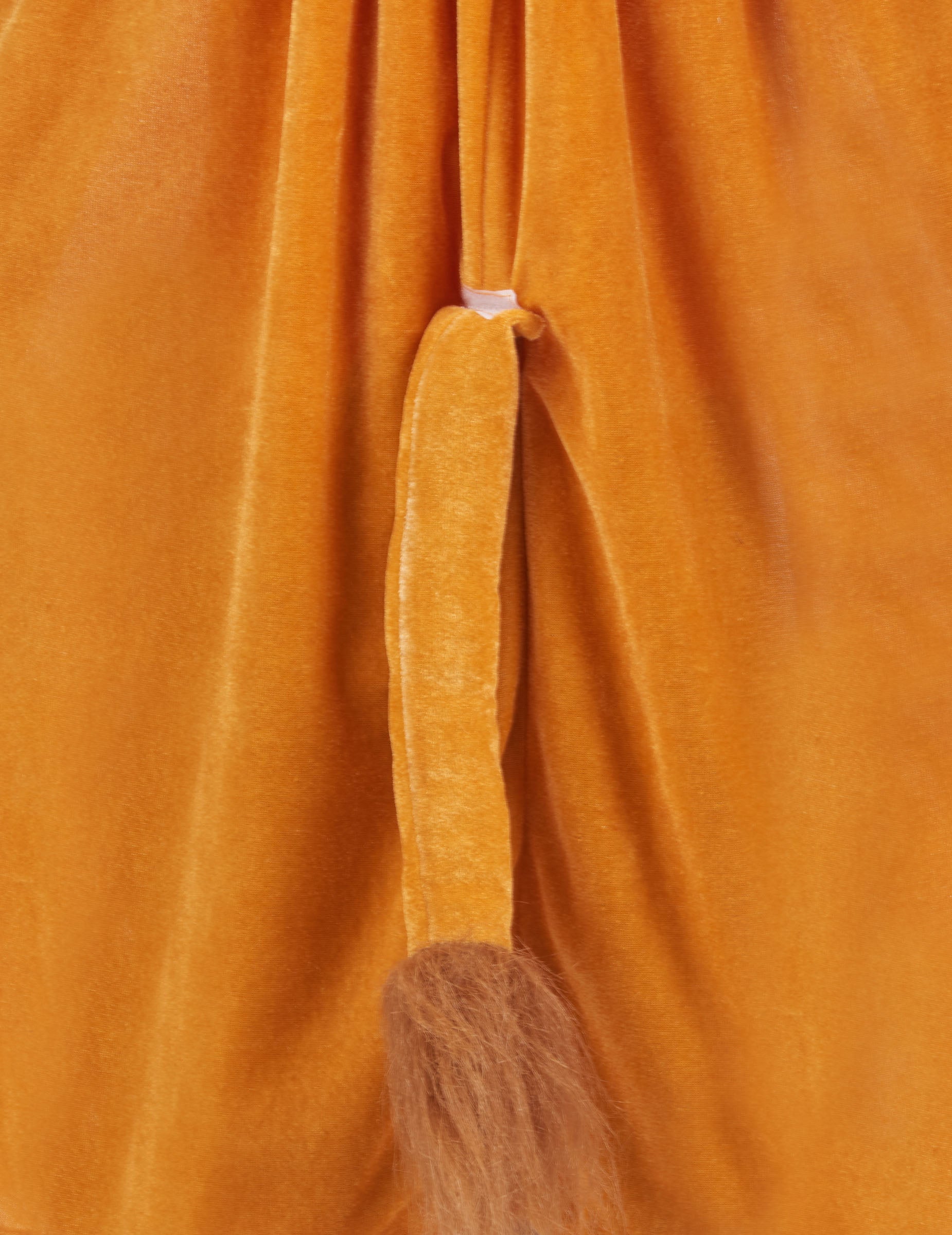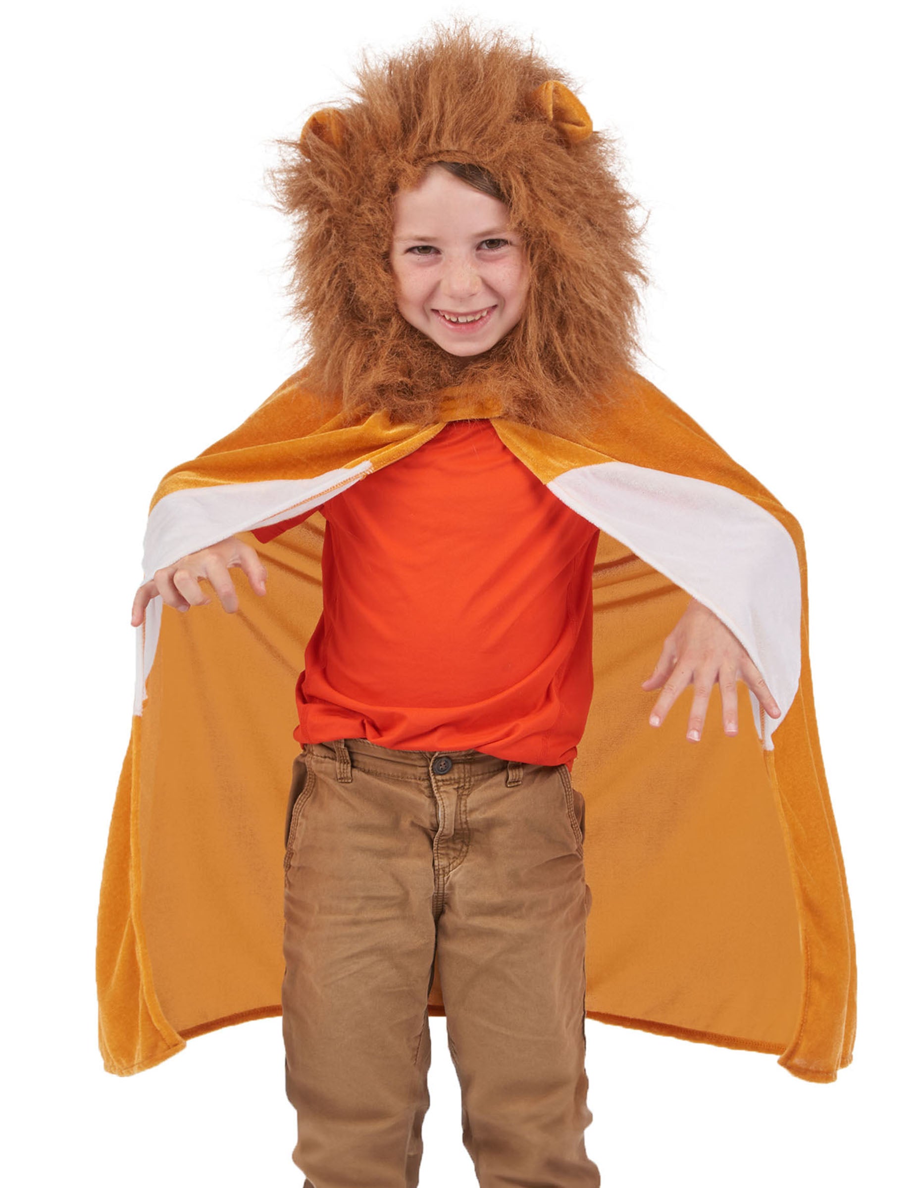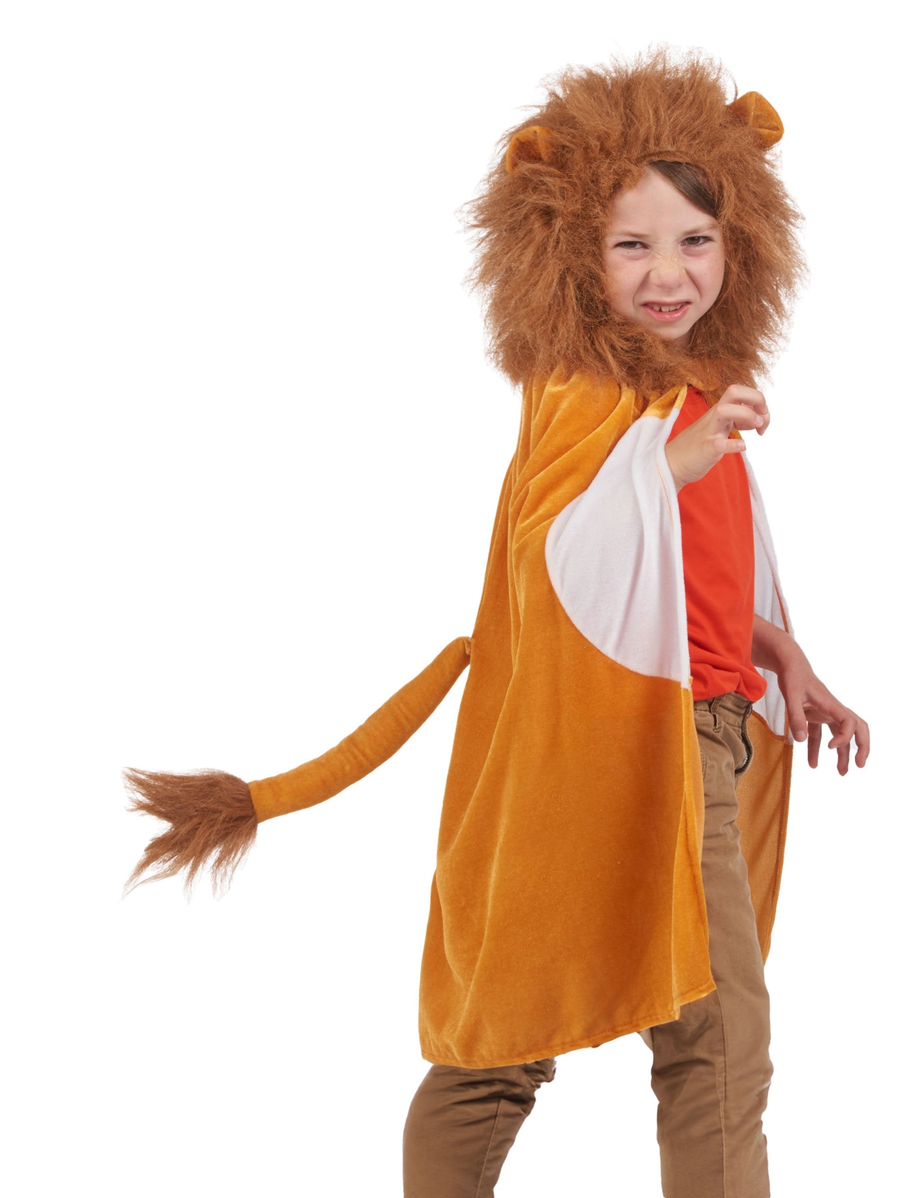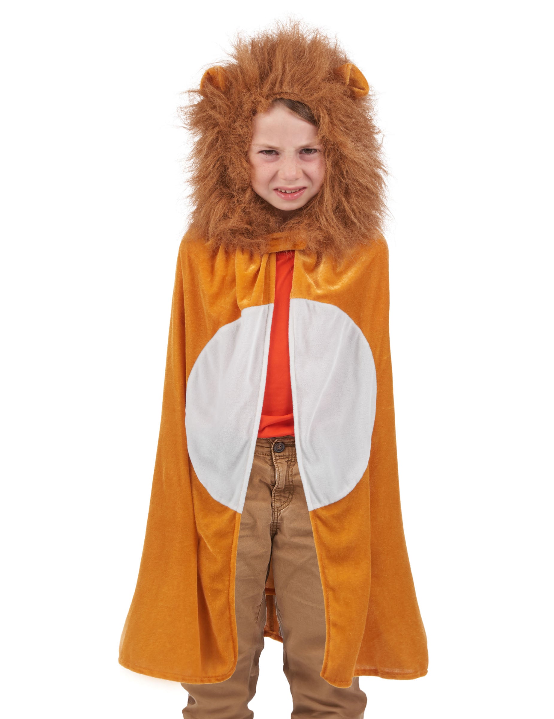 Farebné Fauve Plášť so zamatovým efektom má kapucňu ozdobenú nádhernou umelou zlatou hrivou a párom uší. Zapína sa na suchý zips na golieri.
