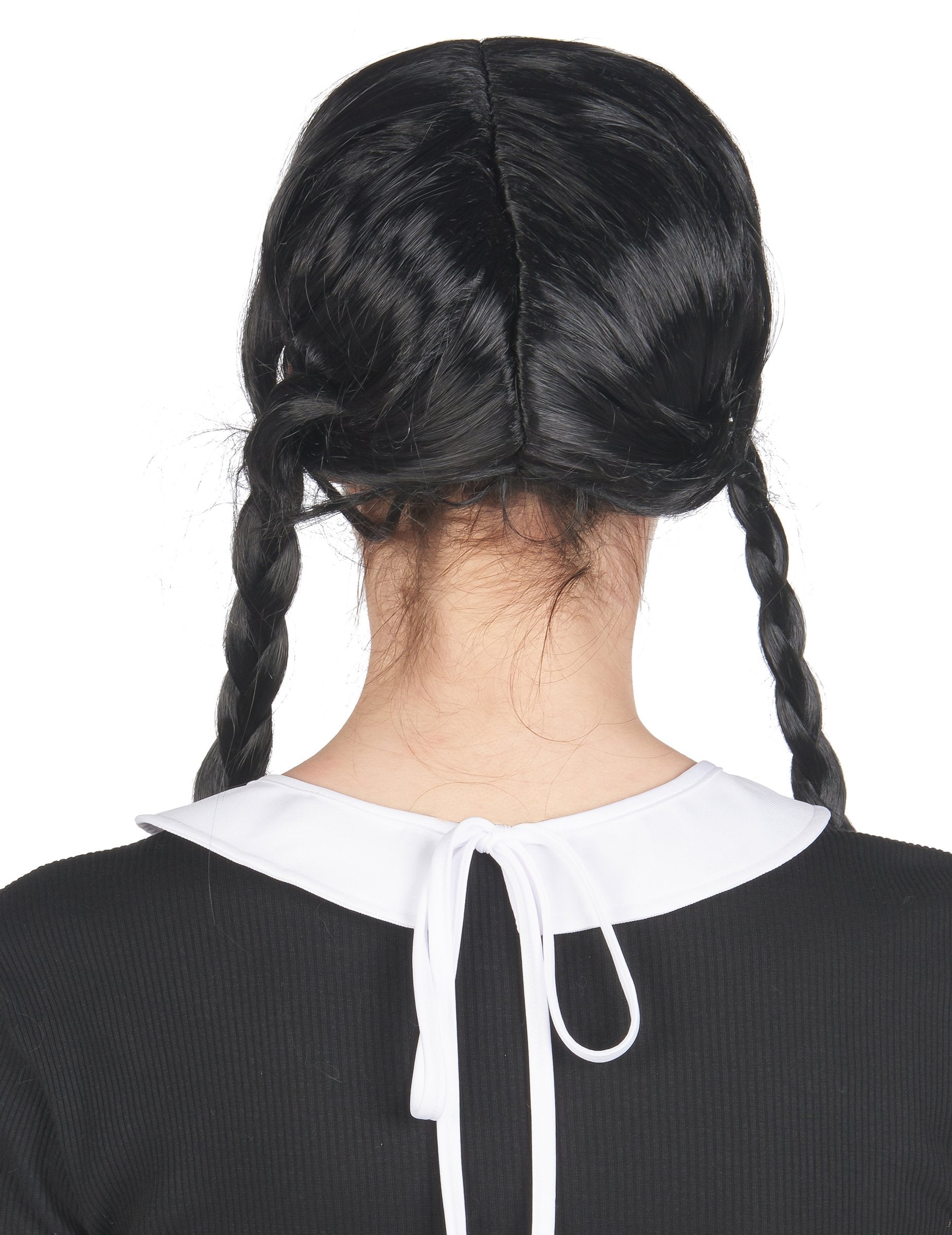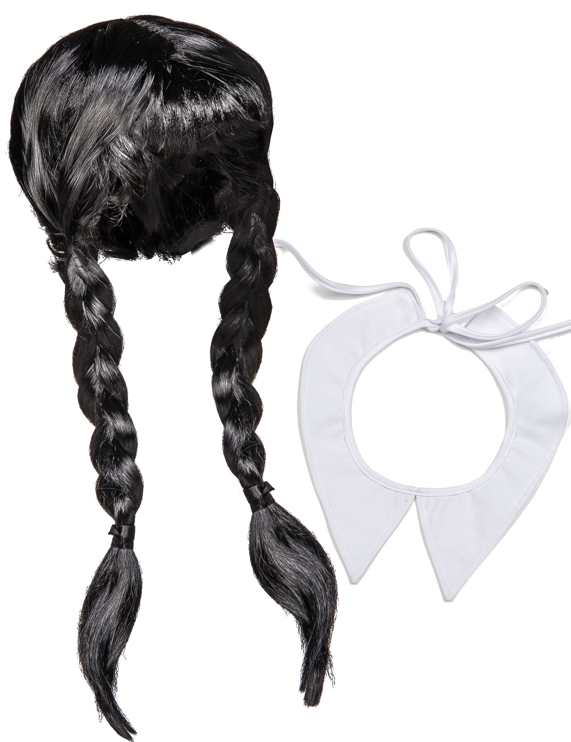 Biely obojok s tipmi pre dospelých Tento biely golier je určený pre dospelých. Toto je bodový golier, ktorý môžete pridať do svojich šiat alebo vesty. Môžete ho zviazať zozadu šnúrkami. Je ideálny na dokončenie vzhľadu gotickej školačky! Gotická parochňa pre dospelých s čiernymi vrkvami Táto čierna parochňa Braid je pre dospelých. Parochňa má na prednej strane aj malý okraj. Môžete to upravovať tak, ako preferujete: koruna vrkôčikov alebo dvojitá opletená buchta. Táto parochňa je ideálna na dokončenie kostýmu gotickej školačky počas Halloweenu.