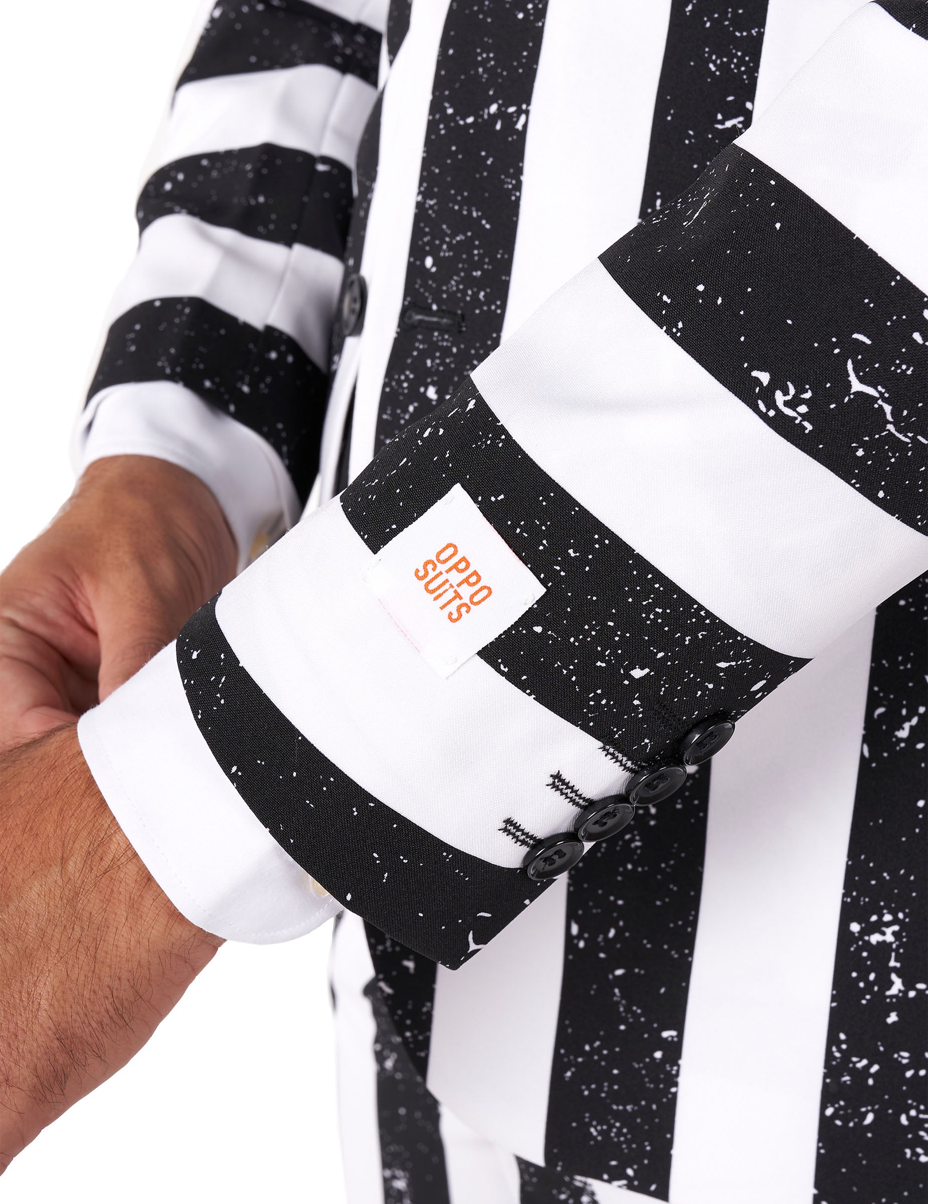 Inšpirovaný filmom z 80. rokov, tento kostým predstavuje outfit slávneho Beetlejuice™. Sako a nohavice sú ozdobené čierno-bielymi vertikálnymi pruhmi, zatiaľ čo kravata je čiernej farby.
